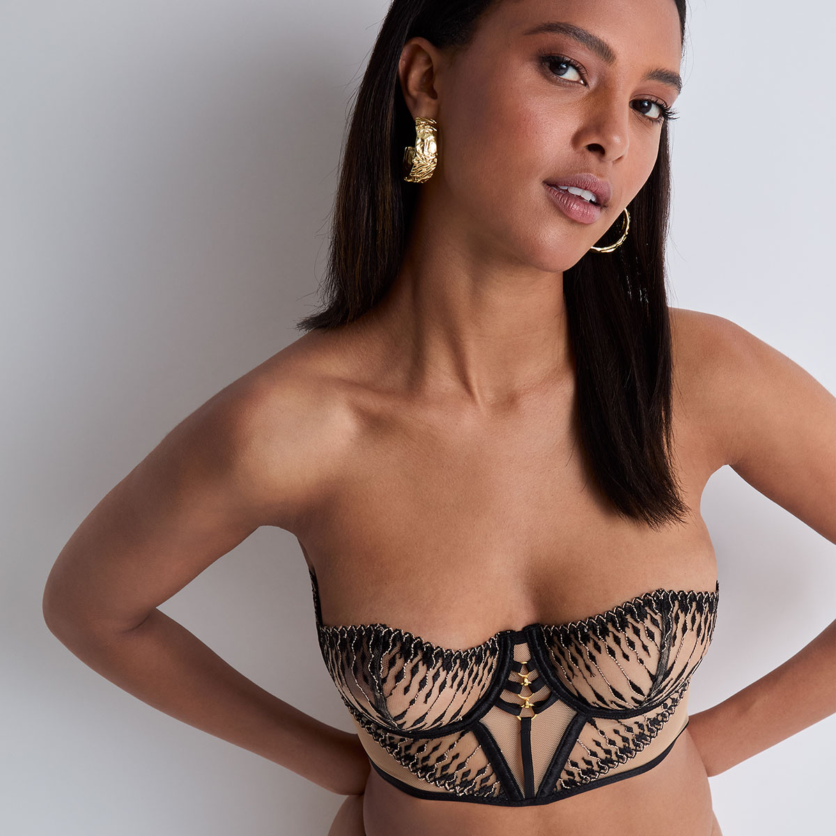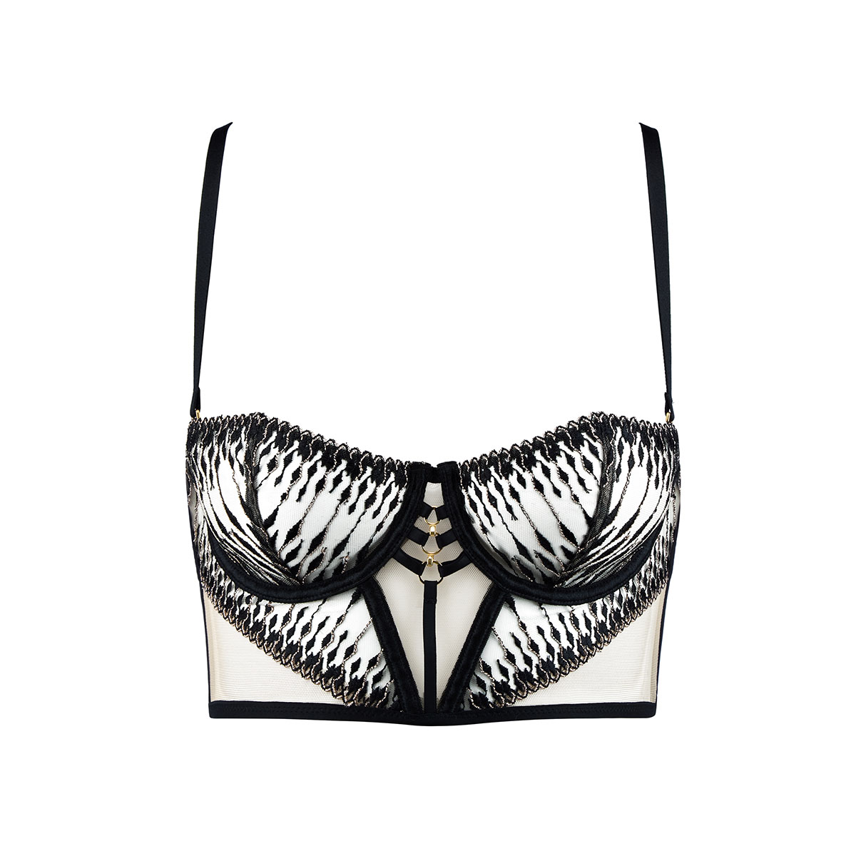 Бюстье с мягкими чашками, на косточках, выполнен из жесткого тюля с вышитым золотой люрексовой нитью змеином рисунком. Переднюю панель украшают золотые кольца из замака. Задняя панель выполнена из эластичной микрофибры. Модель имеет бесшовную и удобную застежку-крючок. Съемные и регулируемые бретели обеспечивают усиленную поддержку и удобную посадку.
