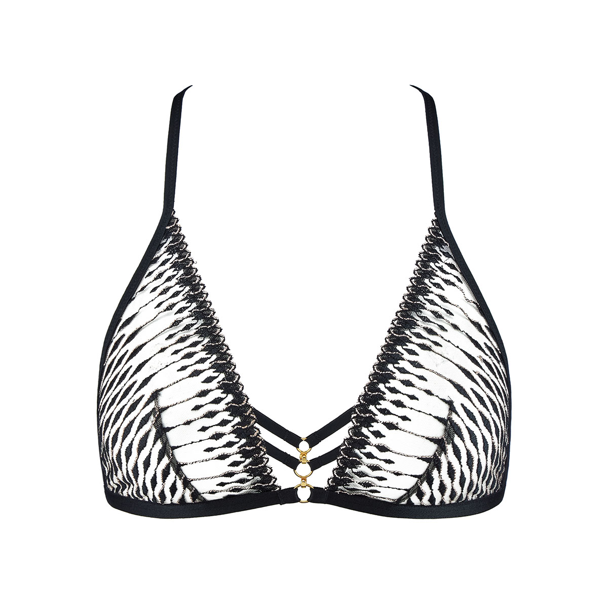 Бюстгальтер-бралет с мягкой формой чашек, без косточек, с невероятно сексуальным декольте. Прозрачная тюль, вышитая золотой люрексовой нитью напоминает змеиную кожу. Спинка максимально открытая. Передняя и задняя панели украшены золотыми кольцами из замака, а эластичные регулируемые бретели обеспечивают комфортную посадку.
