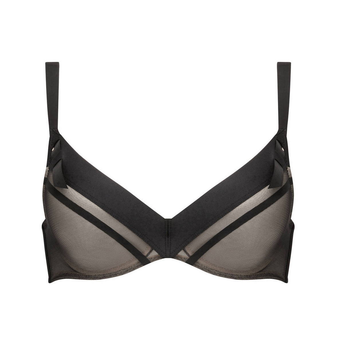 Бюстгальтер - пуш ап с интегрированными подушками. Чашки покрыты тюлем с графичными полосками. Область декольте с эффектом воротничка. Задняя панель - бесшовная. Регулирующиеся бретели.