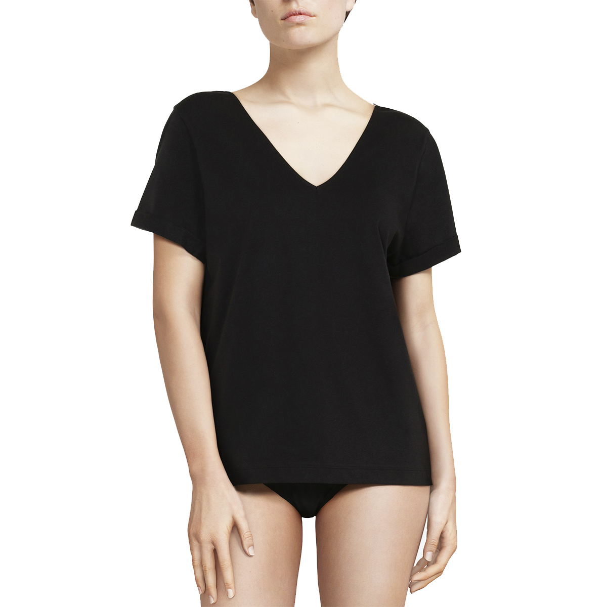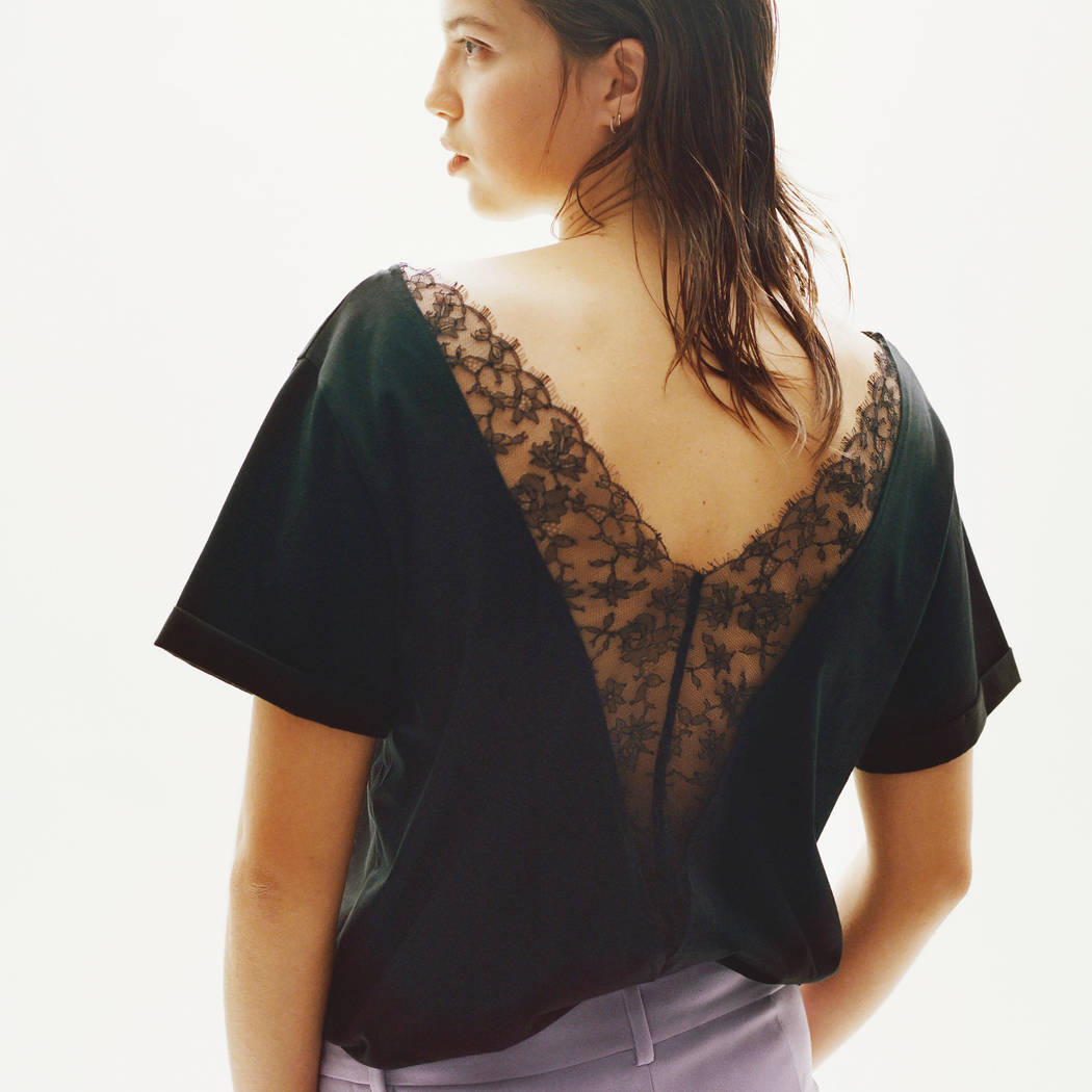 Футболка свободного кроя с глубоким V-образным декольте. С короткими рукавами. Выполнена из 100% хлопка. Еще более глубокое декольте - на задней панели, которое дополнено кружевом с цветочным орнаментом.
