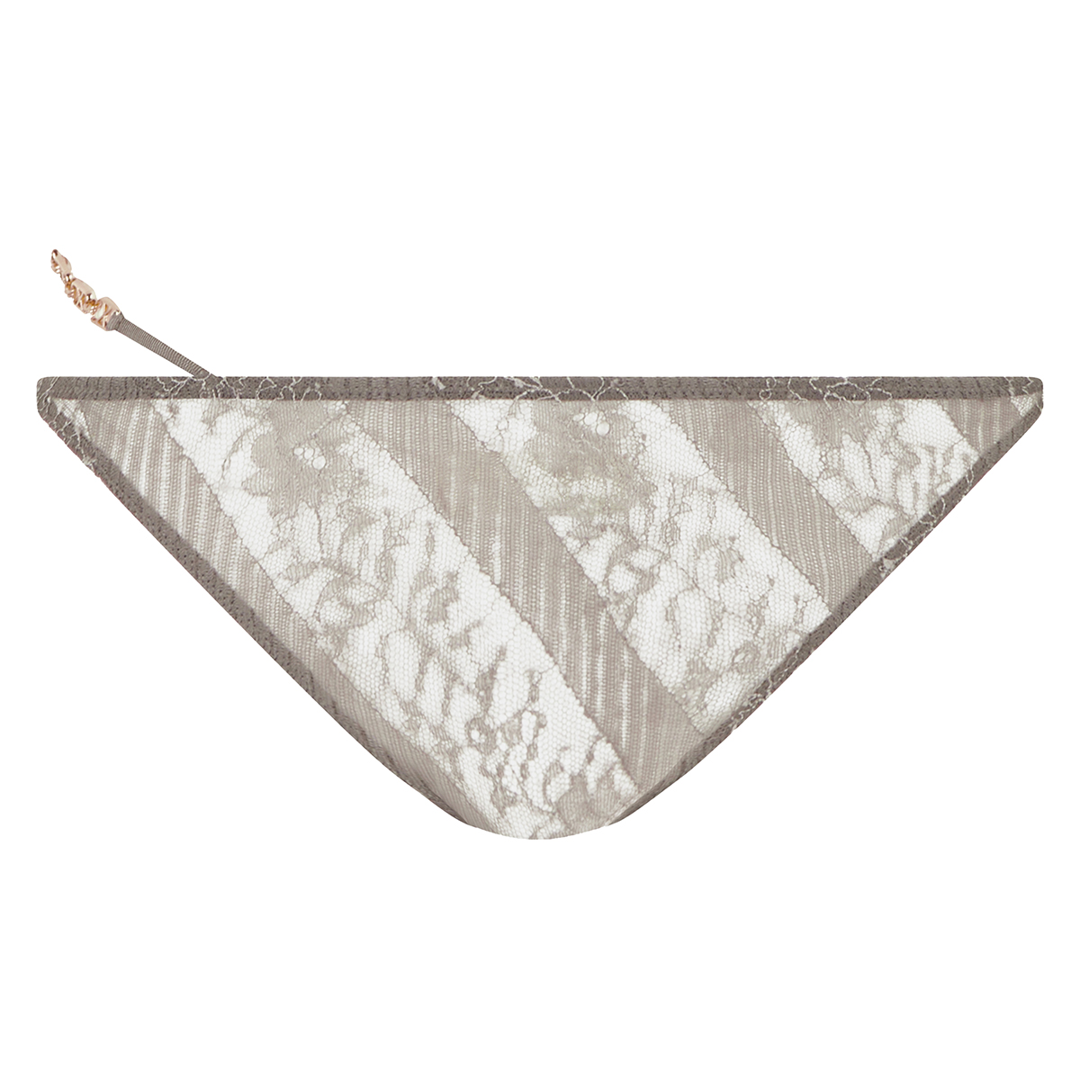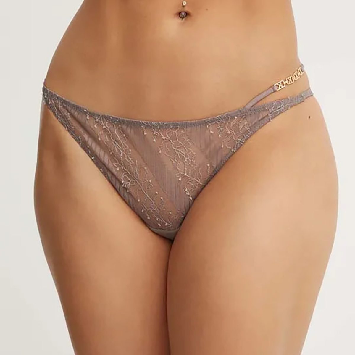 Изысканные трусы-стринги со средне-заниженной посадкой — воплощение лёгкости и соблазнительной элегантности. Передняя панель выполнена из прозрачного кружева с утончённым цветочным орнаментом, подчёркивающего женственность. Задняя панель из гладкого тюля создаёт ощущение невесомости, а небольшой кокетливый вырез дополняет образ. Завершающий штрих модели - фирменные золотые украшения.