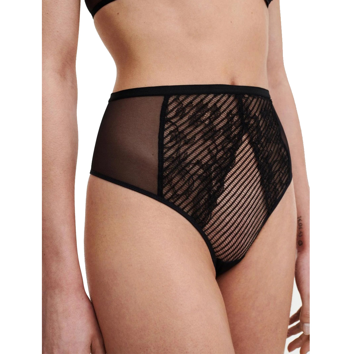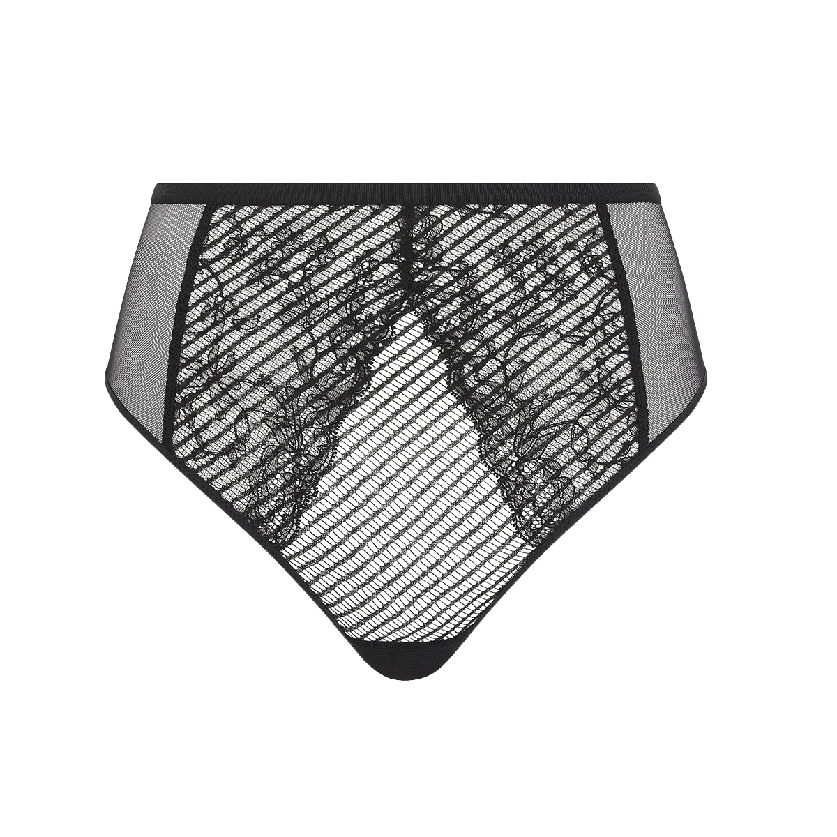 Трусы c высокой талией с высокой посадкой. Задняя панель в форме стрингов. Передняя панель выполнена из кружева Leavers с цветочным и графичным орнаментом; задняя - из кружева Leavers с цветочным орнаментом и дополнена золотистой деталью с эксклюзивным дизайном; боковые панели – из прозрачного тюля.