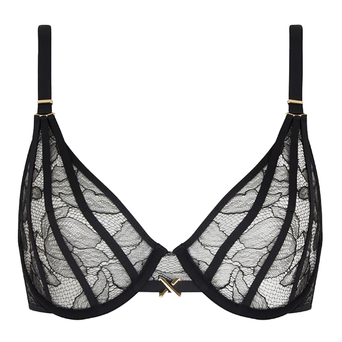 Бюстгальтер-треугольник на косточках, с мягкой формой чашек. Выполнен из прозрачного цветочного кружева, которое очаровывает с первого взгляда, создавая утончённый и притягательный образ. Глубокий вырез на передней панели придает модели сексуальности, а изящные ремешки и золотые украшения придают модели нотку роскоши. Задняя панель из мелкой сетки обеспечивает лёгкость и комфорт, а 4 двойные застёжки-крючка гарантируют идеальную посадку. Несъёмные регулируемые бретели с изысканными золотистыми кольцами завершают образ.