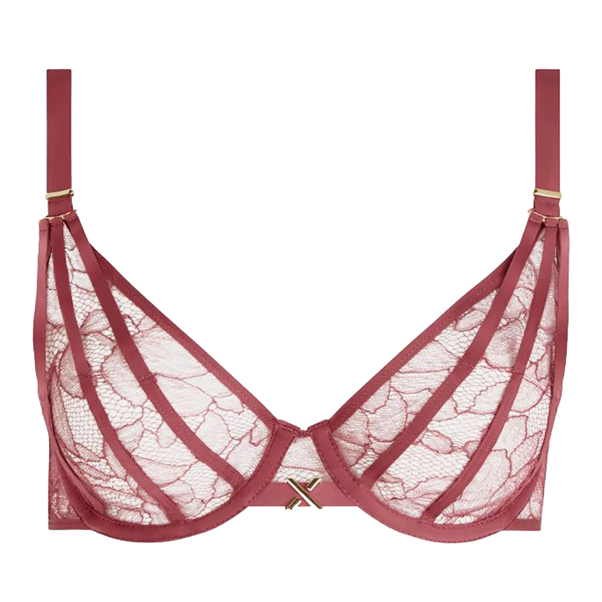 Бюстгальтер-треугольник на косточках, с мягкой формой чашек. Выполнен из прозрачного цветочного кружева, которое очаровывает с первого взгляда, создавая утончённый и притягательный образ. Глубокий вырез на передней панели придает модели сексуальности, а изящные ремешки и золотые украшения придают модели нотку роскоши. Задняя панель из мелкой сетки обеспечивает лёгкость и комфорт, а 4 двойные застёжки-крючка гарантируют идеальную посадку. Несъёмные регулируемые бретели с изысканными золотистыми кольцами завершают образ.