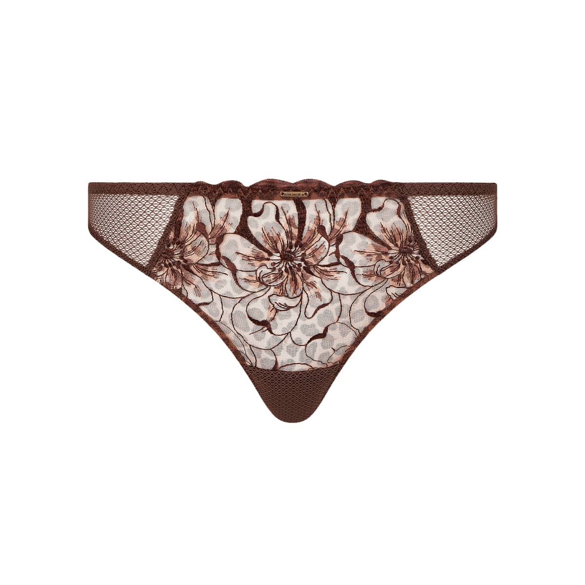 Трусы - стринги со средне-заниженной посадкой. Практически полностью, выполнены из расшитого цветочным орнаментом тюля. Боковые панели - из сетки. Передняя панель дополнена "золотым" аксессуаром с логотипом бренда.