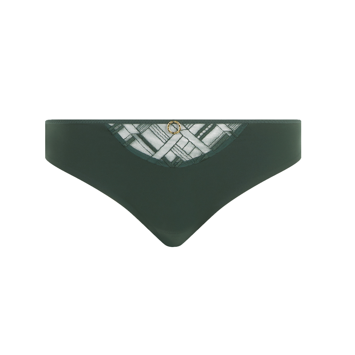 Трусы классические со средне-заниженной посадкой. Практически полностью, выполнены из мягкой микрофибры. Передняя панель дополнена вставкой из тюля с графичной вышивкой и золотистым кольцом с логотипом. Задняя панель с "необработанными" краями.