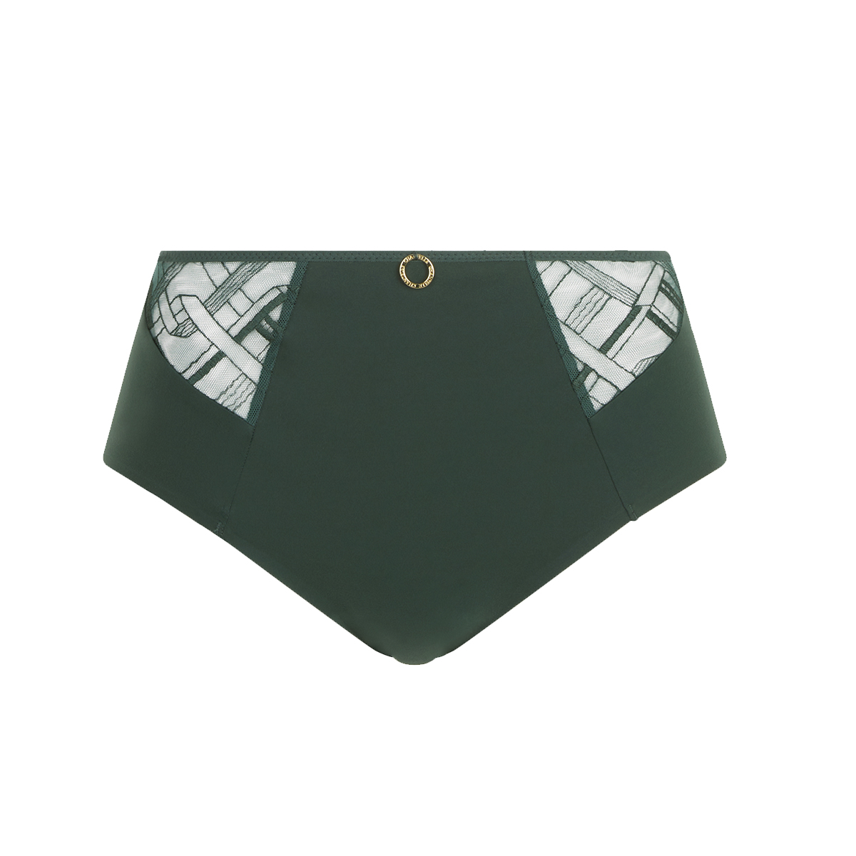 Трусы с высокой талией с высокой посадкой. Практически полностью, выполнены из мягкой микрофибры. Дублированная передняя панель дополнена вставками из тюля с графичной вышивкой и золотистым кольцом с логотипом. Задняя панель с "необработанными" краями.