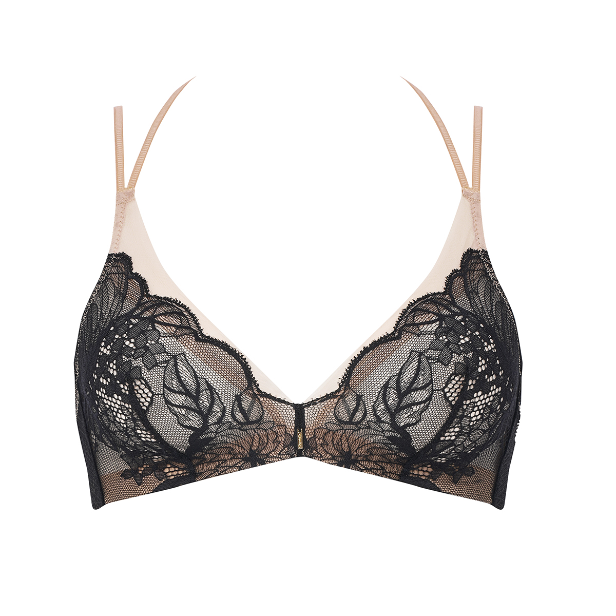 Бюстгальтер - бралет с мягкой треугольной формой чашек без косточек. Чашки выполнены из бежевого тюля и покрыты контрастным черным кружевом с цветочным орнаментом. Основа бюстгальтера - широкая эластичная тесьма - для придания дополнительной поддержки. Боковые панели выполнены из "двойного" тюля. Оригинальный регулирующиеся бретели.
