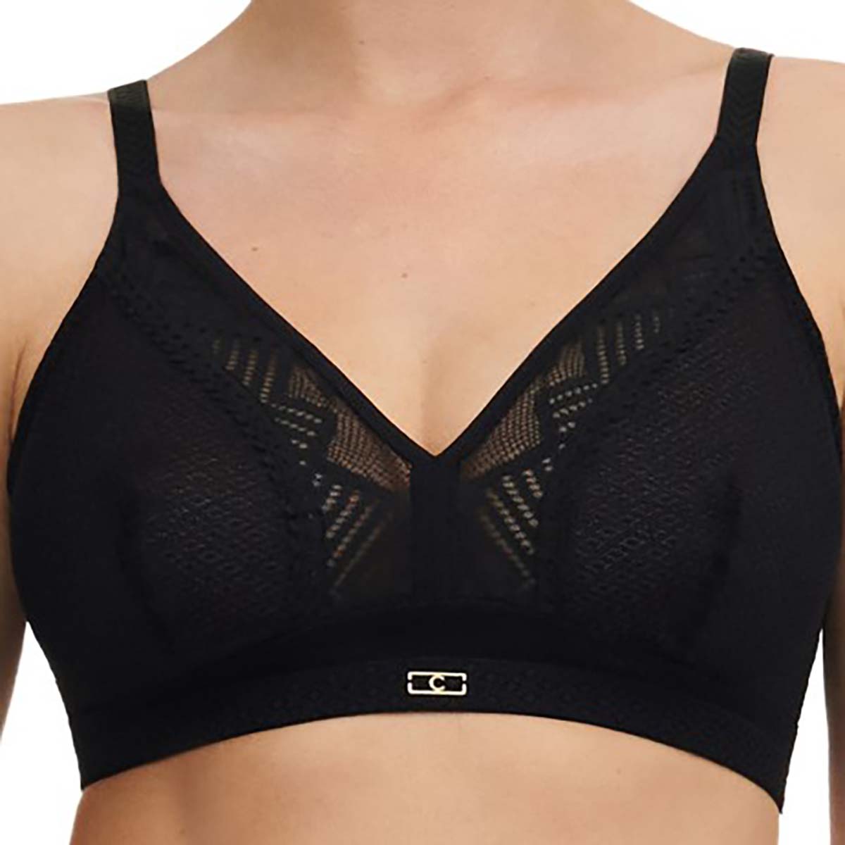 Бюстгальтер-бралет с мягкой треугольной формой чашек, без косточек. Выполнен из мягкой микрофибры, вырез декорирован кружевом с геометрическим орнаментом. Передняя панель украшена золотым логотипом. Эластичная резинка под грудью и регулируемые бретели обеспечивают идеальную посадку и комфорт.