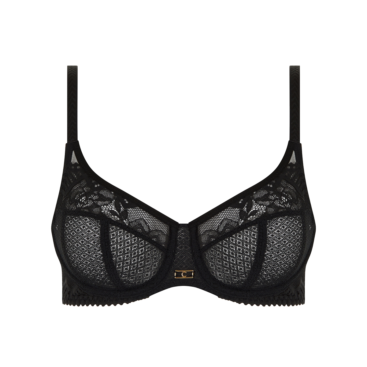 Бюстгальтер классический на косточках с максимально закрытыми мягкими чашками. Выполнен из приятного на ощупь материала, который нежно прилегает к телу. Модель декорирована кружевом с цветочным и геометрическим орнаментами, на передней панели разместился фирменный золотой логотип Chantelle. Бретели регулируемые.