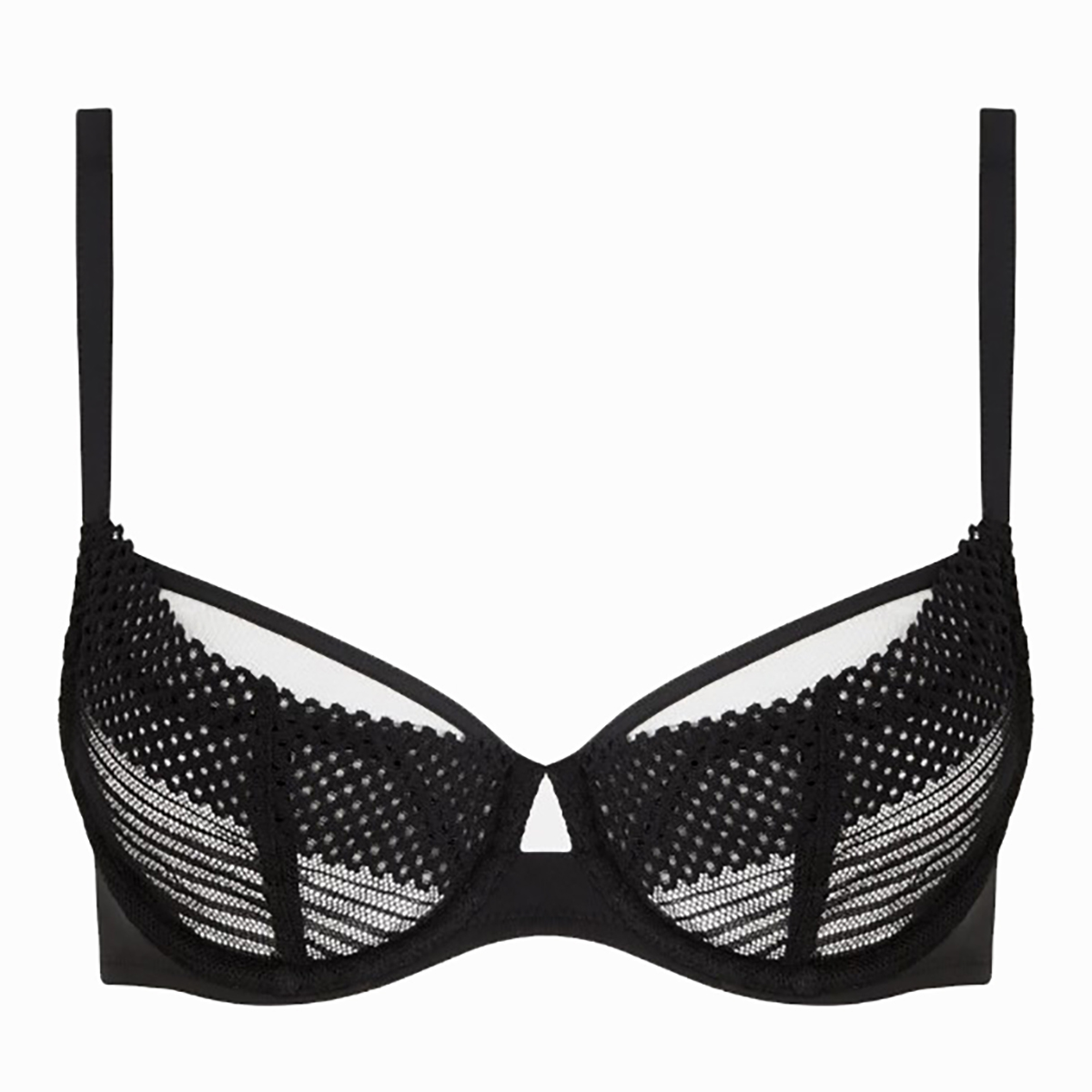 Бюстгальтер-балконет с мягкой формой чашек на косточках, выполнен из мягкой микрофибры. Чашки покрыты кружевом и сеткой, дополнены вставками из тюля. Эластичные бретели регулируются для более удобной посадки.