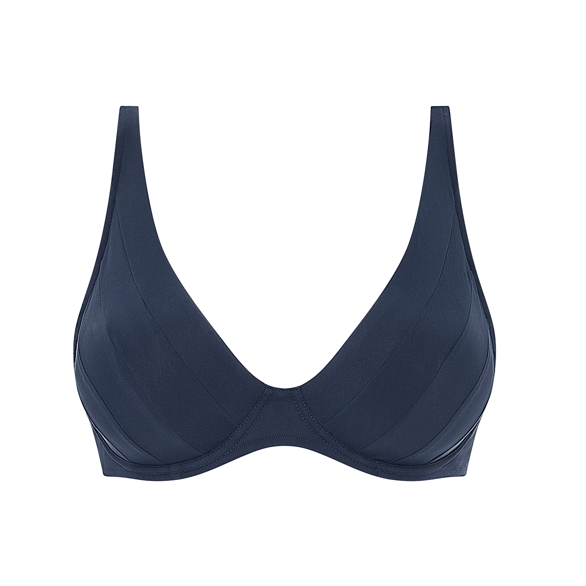 Классический бюстгальтер на косточках с мягкой треугольной формой чашек с глубокой линией декольте. Чашки выполнены из микрофибры в полоску, что придает морской стиль. Регулирующиеся бретели имеют несколько вариантов для перестегивания.