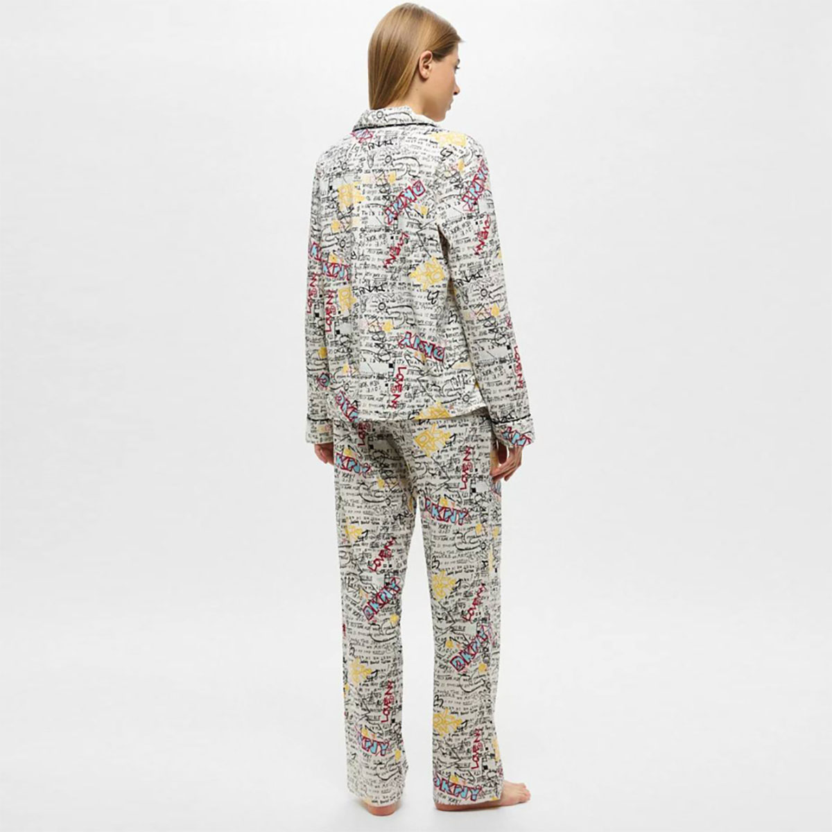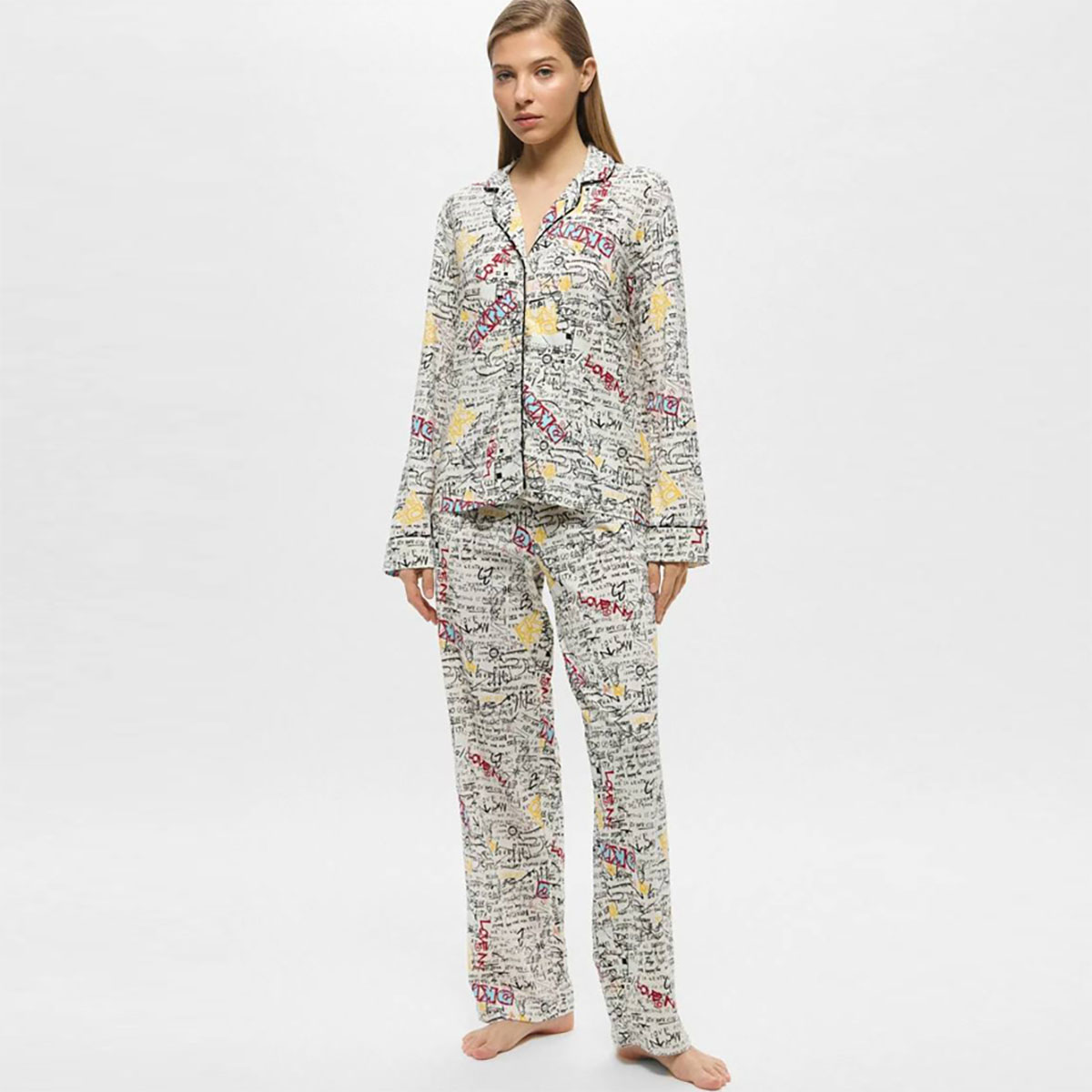 Классическая пижама свободного кроя, состоящая из рубашки и широких брюк. Нежный хлопковый материал дарит коже незабываемые ощущения комфорта, а рисунок делает образ ярче. Рубашка на пуговицах имеет минималистичный изящный воротник, а длинные рукава дополнены широкими манжетами. Свободные брюки на эластичной резинке удобно сидят на бедрах.
