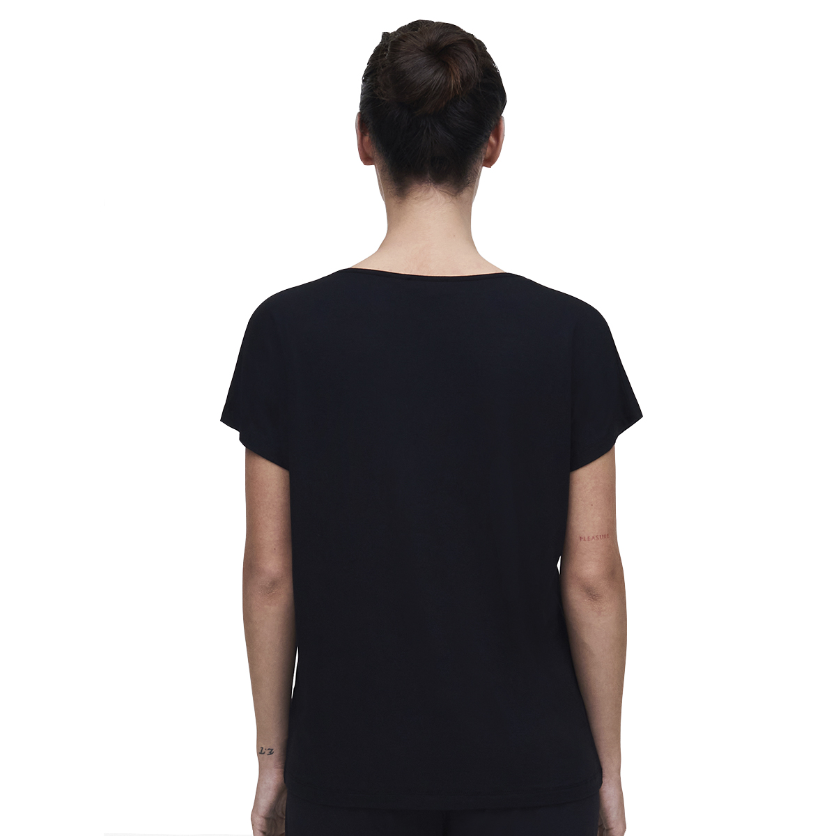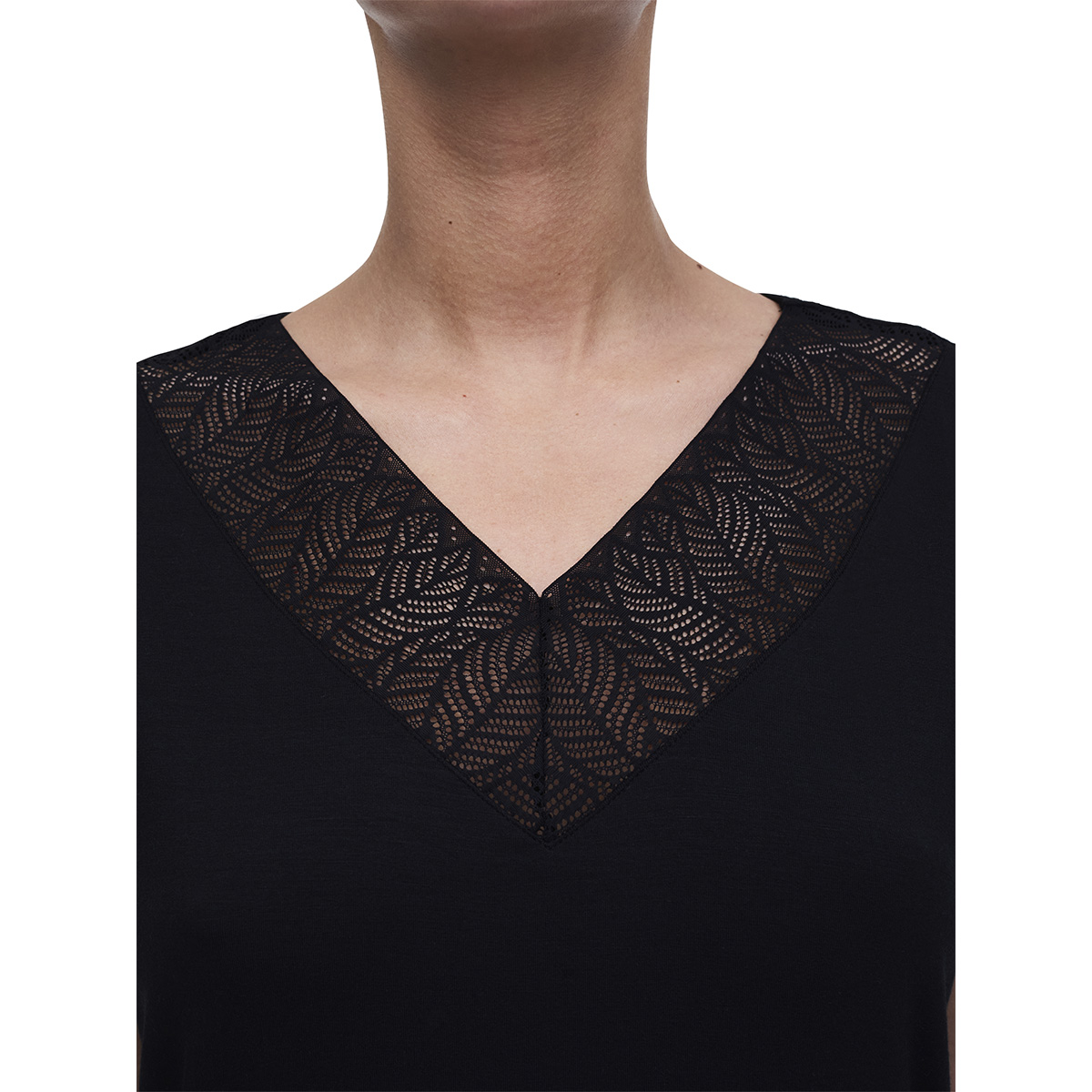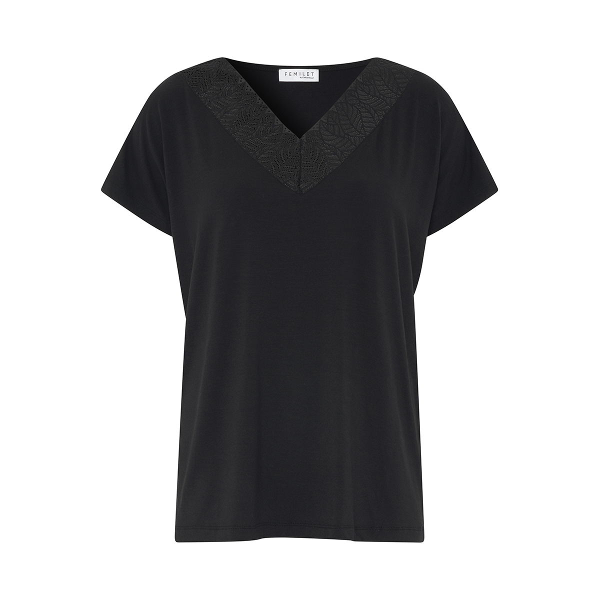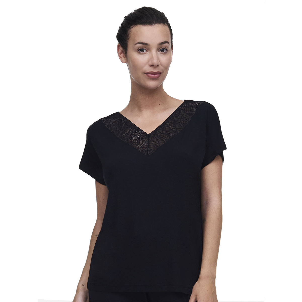 Футболка свободного кроя с V-образным вырезом с короткими рукавами. Область декольте декорирована кружевом. Выполнена из "струящегося" модаля.