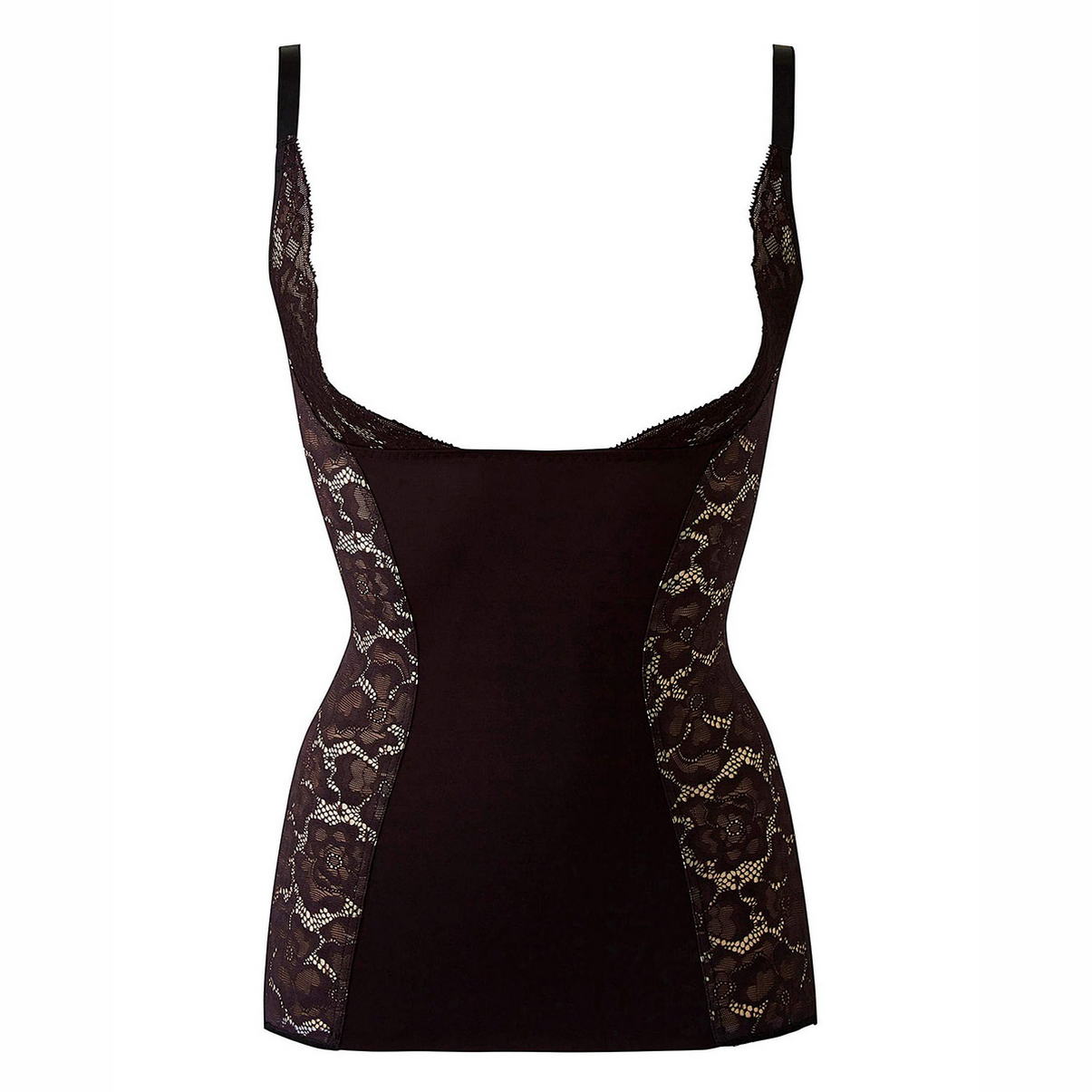 Бесшовный, неэлектризующийся, выплоненный из "невесомого" материала топ, который визуально откорректирует Ваш торс. Открытая область груди позволяет носить Ваш бюстгальтер. Кружевные вставки в области подмышек, дублированные тюлем, откорректируют проблемные участки. Передняя панель, полностью дублированная тюлем, с плоскими швами сделает Ваш живот(визуально) более плоским. Задняя панель со швами - чтобы улучшить "прилегание". Регулирующиеся бретели. Плоская отделка нижнего края. Округлая спинка.