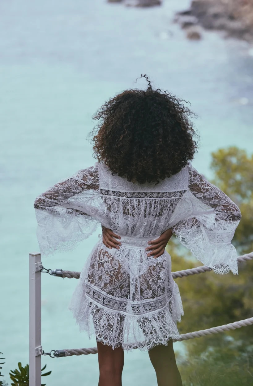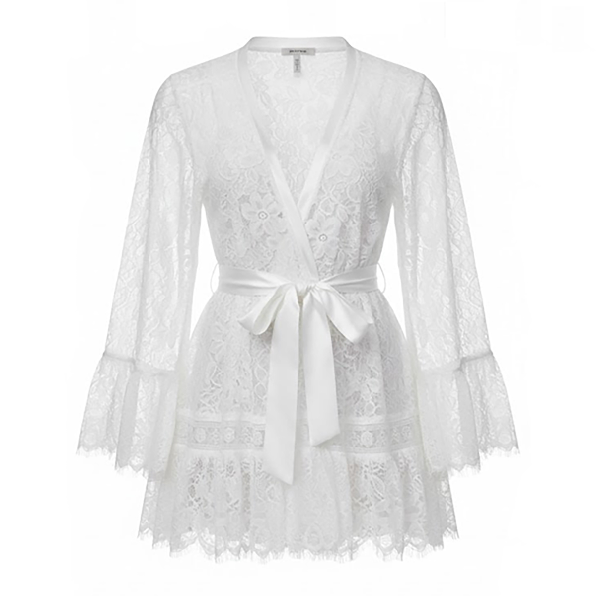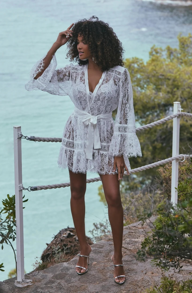 Короткий халат свободного кроя с длинными широкими рукавами, выполнен из элегантного кружева с изысканным цветочным орнаментом, создающего тонкую игру прозрачности и соблазна. Модель дополнена атласным съёмным поясом, который аккуратно подчёркивает линию талии и завершает образ утончённой женственности.