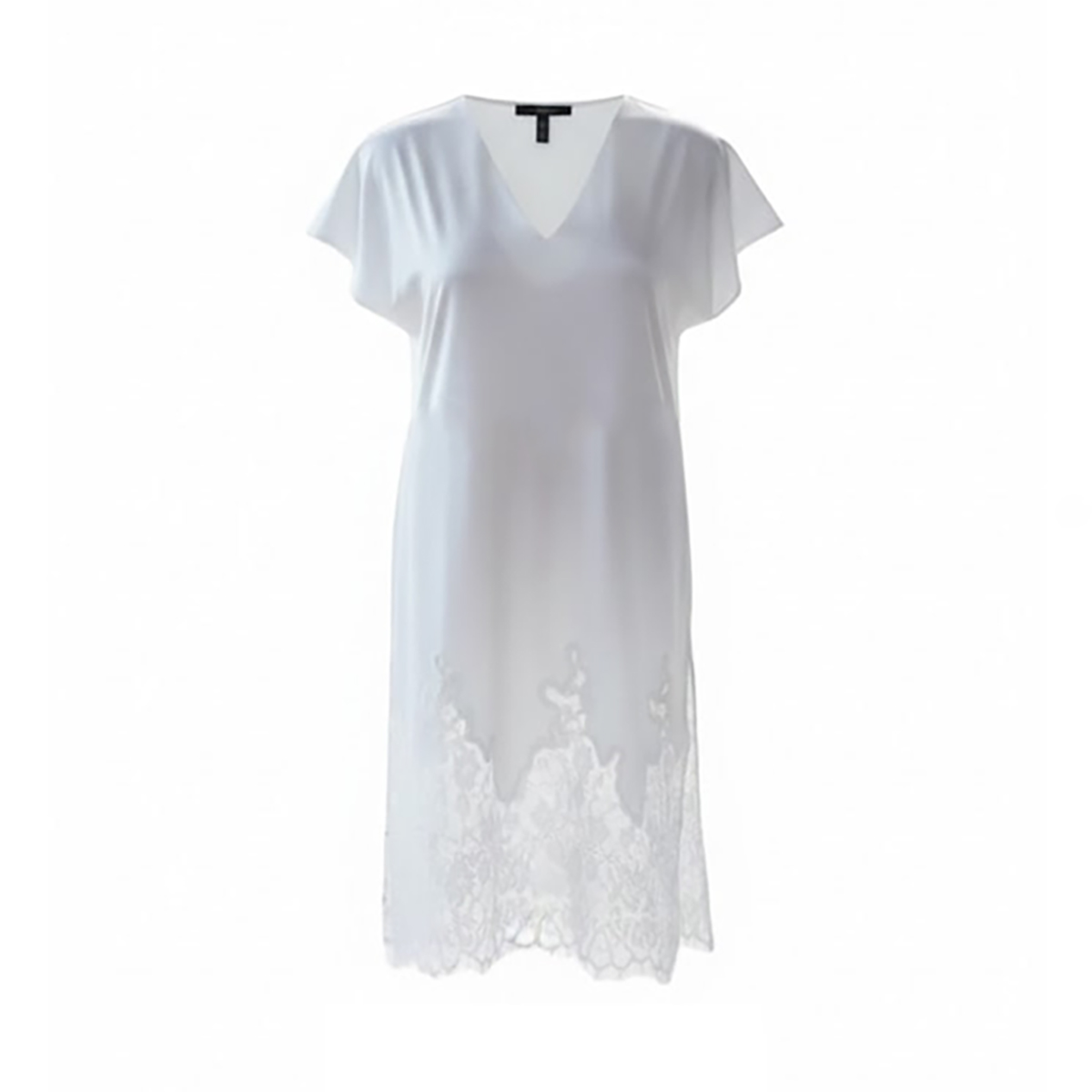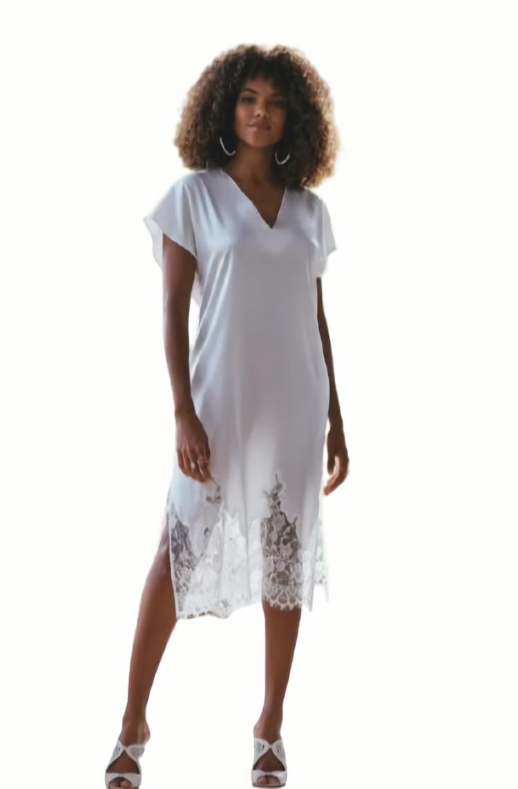 Рубашка свободного кроя средней длины с короткими рукавами, выполненная из нежного шелкового атласа, сочетает в себе вневременную элегантность и абсолютный комфорт. Имеет женственный V-образный вырез. Нижний край модели украшен вставкой из романтичного цветочного кружева, создающего воздушный и утончённый акцент.