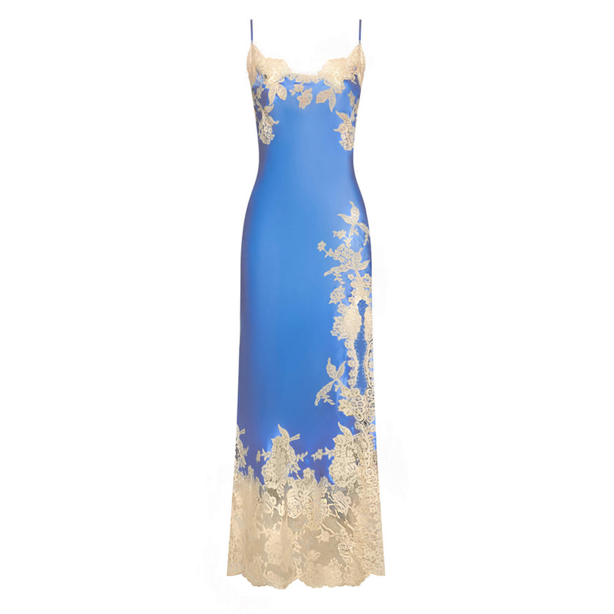 Длинная комбинация свободного кроя, выполненная из изысканно мягкого шёлкового атласа, нежно струящегося по телу. Модель украшена изящным кружевом с цветочным орнаментом, подчёркивающим её романтичный характер. Тонкие регулируемые бретели позволяют идеально подогнать посадку, а открытая спинка добавляет образу соблазнительности. Боковой разрез завершает дизайн, придавая модели лёгкость, грацию и изысканную женственность.