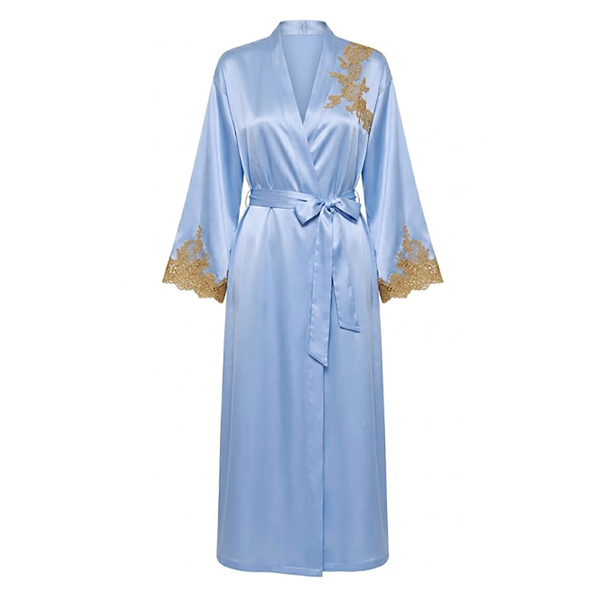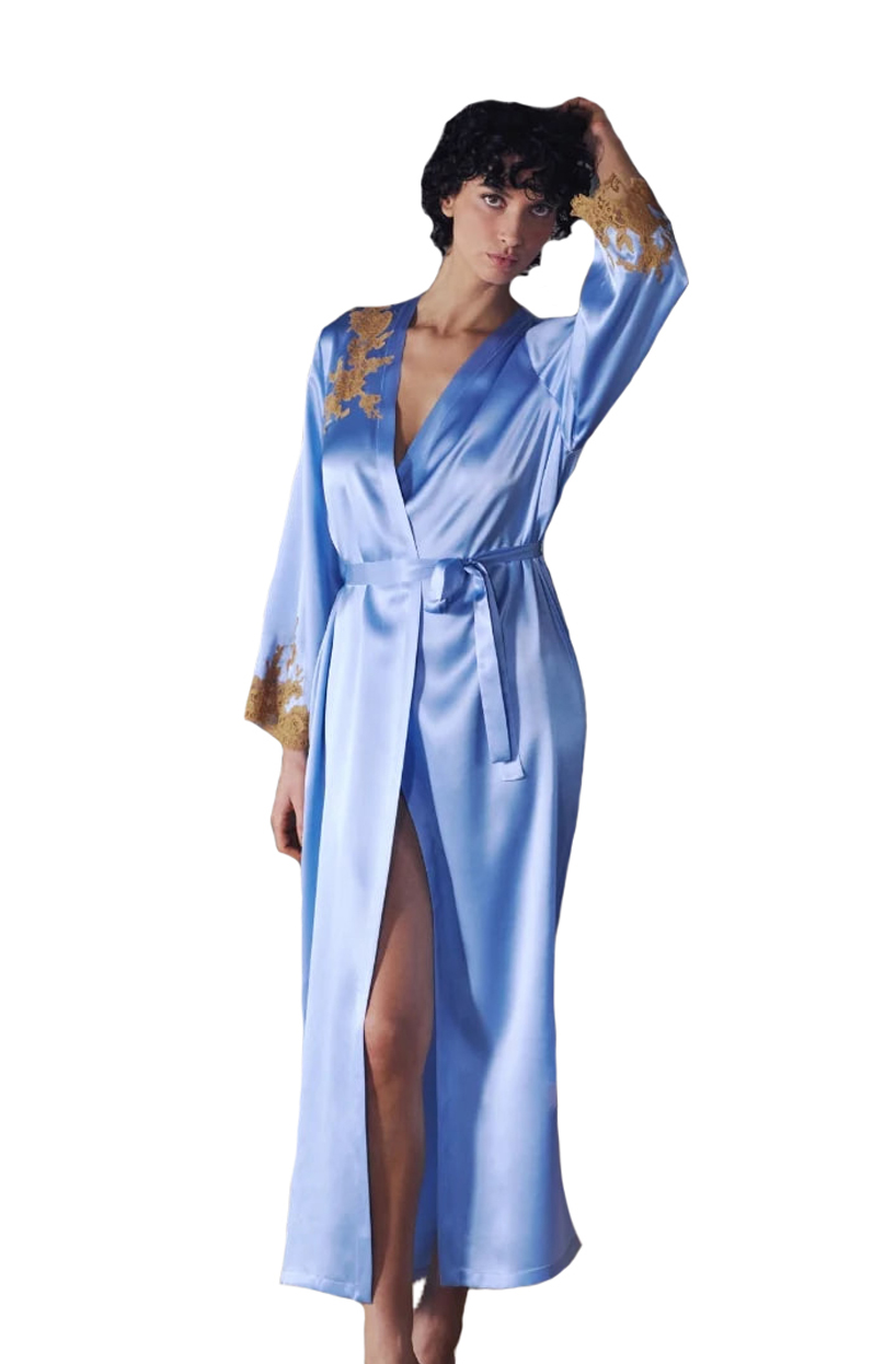 Длинный халат свободного кроя с широкими рукавами, выполнен из роскошного шелкового атласа. Передняя панель и рукава украшены утончённым цветочным кружевом, добавляющим образу романтичности и соблазнительной нежности. Завершает модель тонкий атласный пояс, позволяющий подчеркнуть талию и создать идеальную, женственную посадку.