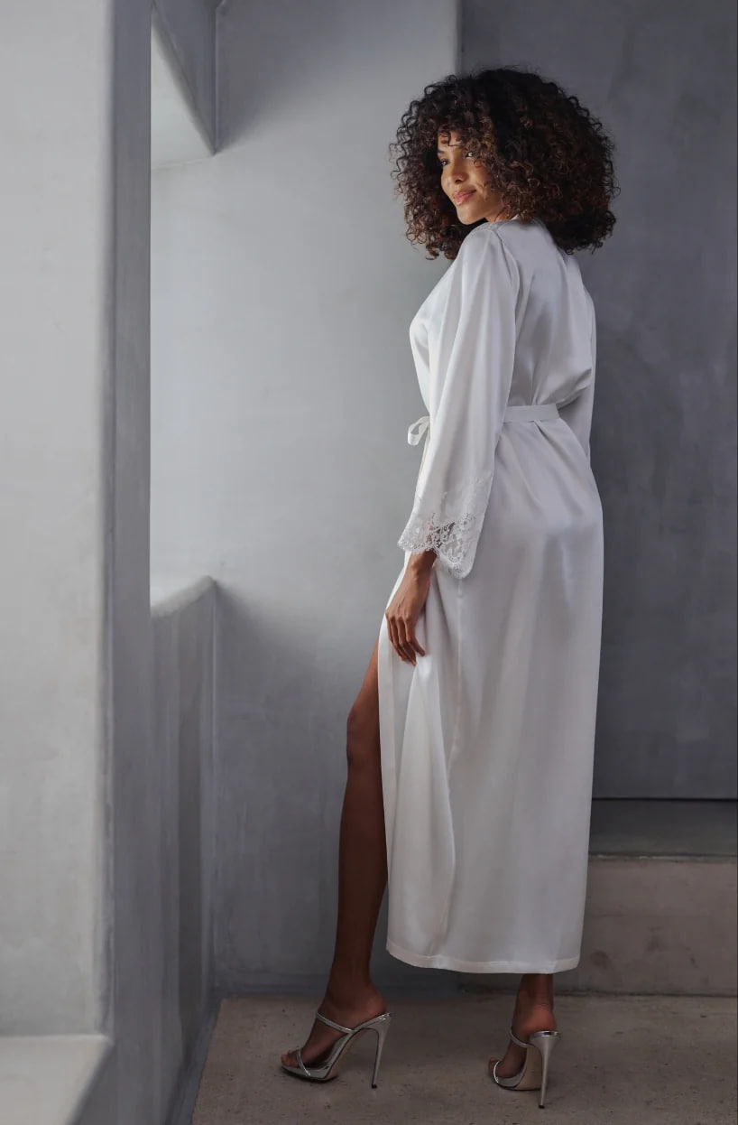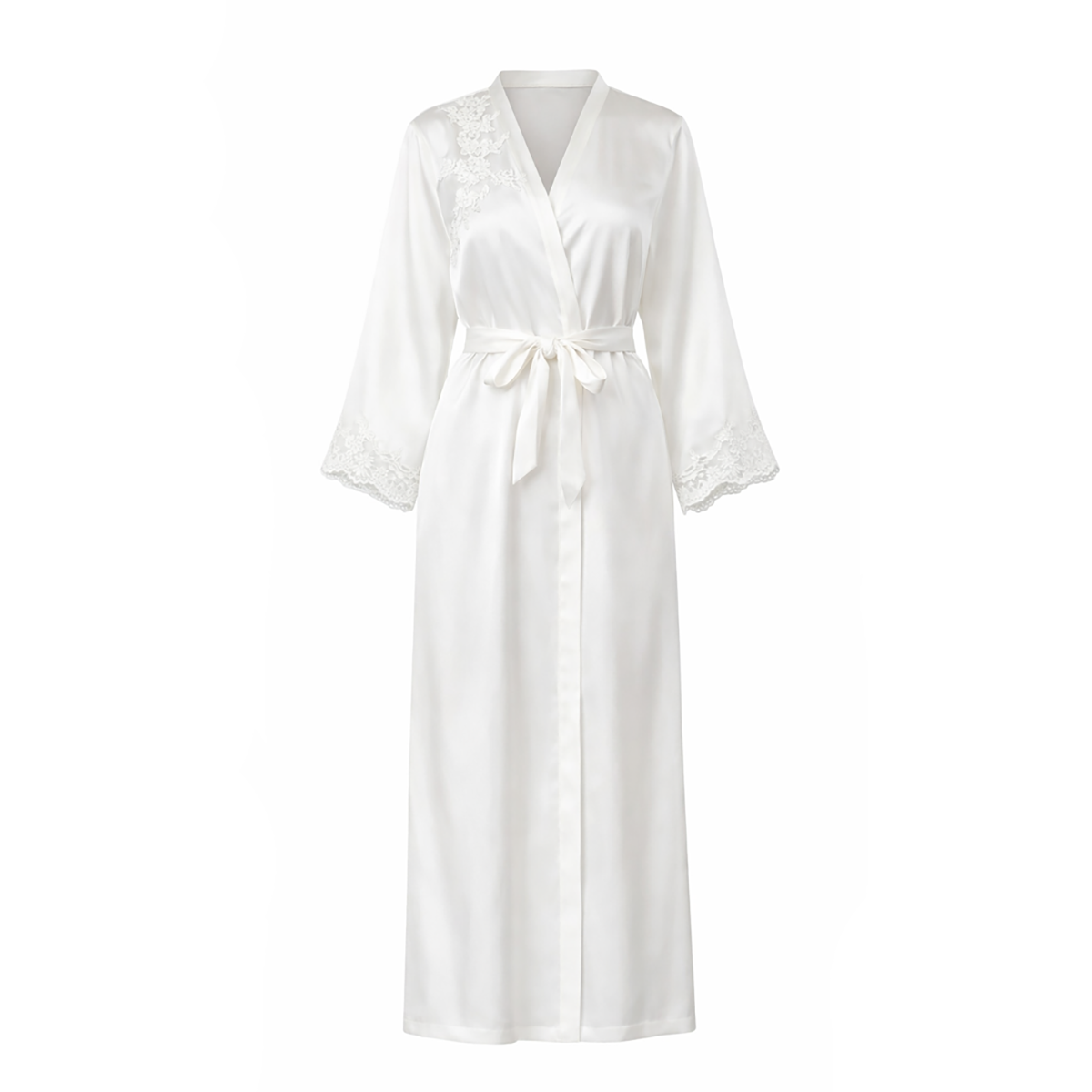 Длинный халат свободного кроя с широкими рукавами, выполнен из роскошного шелкового атласа. Передняя панель и рукава украшены утончённым цветочным кружевом, добавляющим образу романтичности и соблазнительной нежности. Завершает модель тонкий атласный пояс, позволяющий подчеркнуть талию и создать идеальную, женственную посадку.