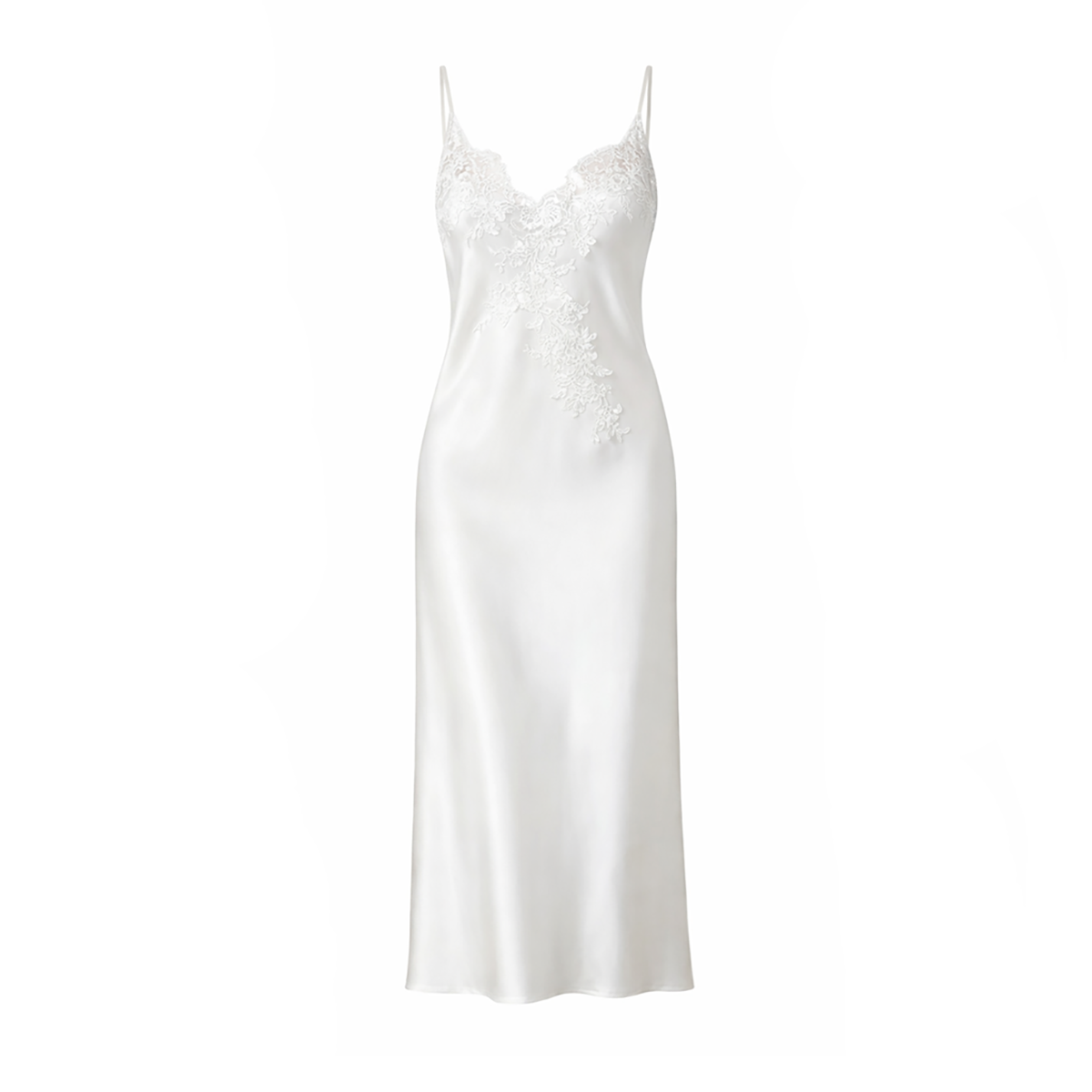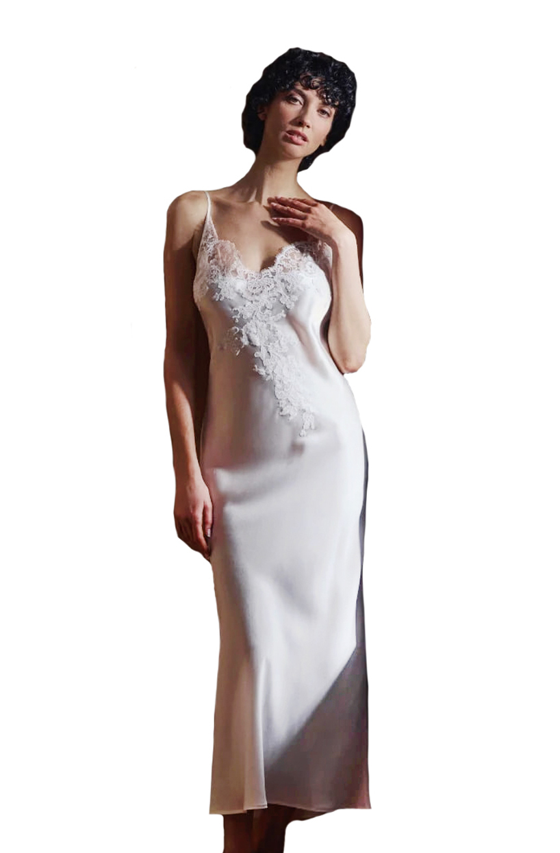 Длинная комбинация приталенного кроя выполнена из гладкого шелкового атласа, который мягко струится по фигуре, подчеркивая её естественные линии. Зона декольте украшена изящным цветочным кружевом, придающим образу женственность и легкую романтичность. Тонкие регулируемые бретели обеспечивают идеальную посадку и комфорт.