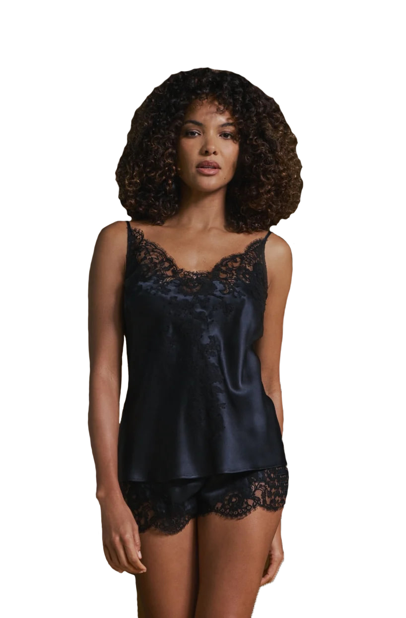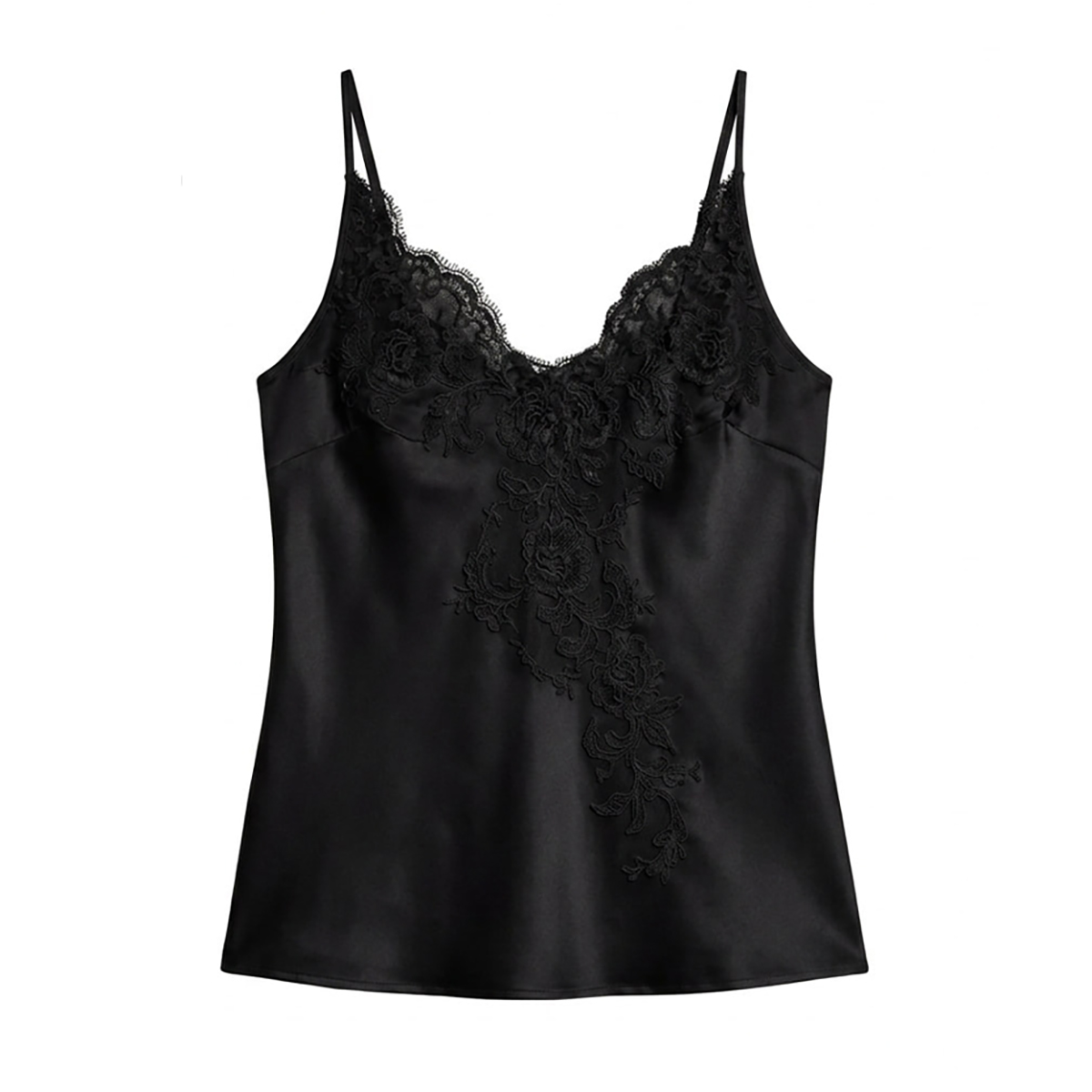 Приталенная майка на тонких регулируемых бретелях выполнена из натурального шелкового атласа, который создает утончённый, роскошный образ. Линия декольте оформлена изящным цветочным кружевом, добавляющим модели романтичности и чувственной элегантности.