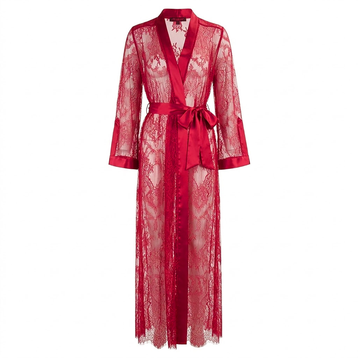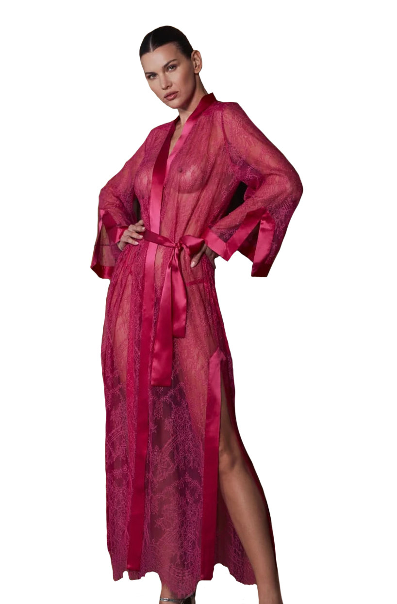 Длинный халат свободного кроя выполнен из нежного струящегося шёлка, который мягко окутывает тело, и прозрачного тюля, украшенного изящным цветочным кружевом. Широкие длинные рукава придают модели воздушность, а тонкий атласный пояс подчёркивает талию и позволяет регулировать посадку. Небольшие надрезы на манжетах и боковых панелях добавляют образу интриги.