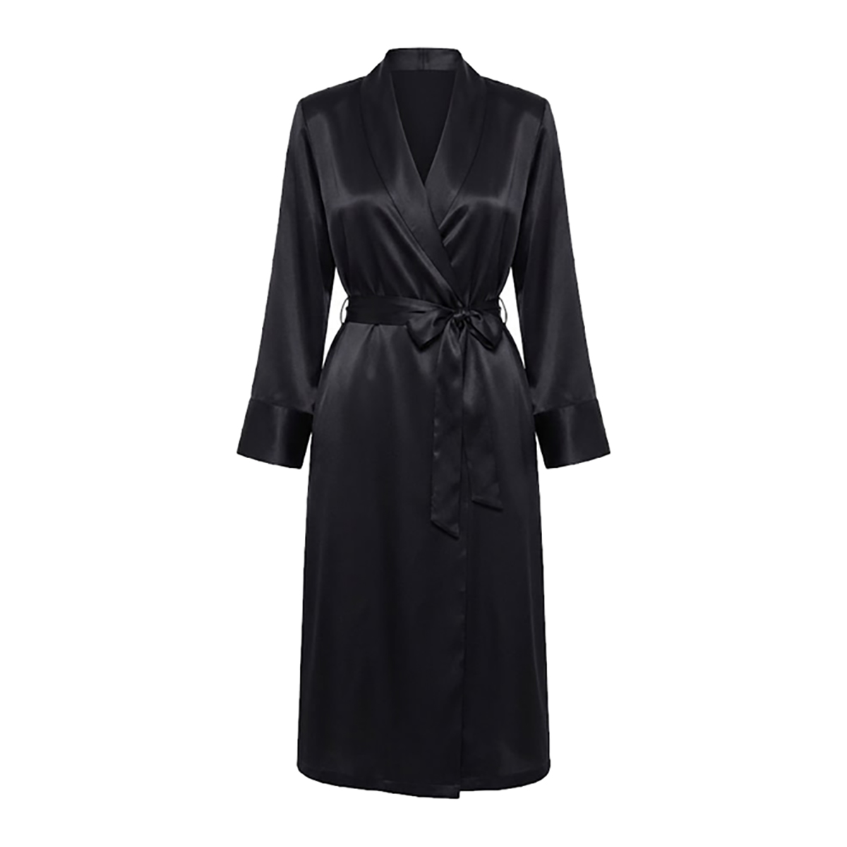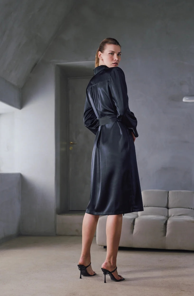 Халат средней длины свободного кроя, выполненный из нежного гладкого атласа, окутывает тело лёгким шелковистым блеском. Длинные рукава с аккуратными манжетами подчёркивают элегантность силуэта, а классический воротник добавляет образу утончённости. Тонкий атласный пояс мягко фиксирует талию.
