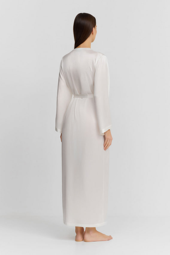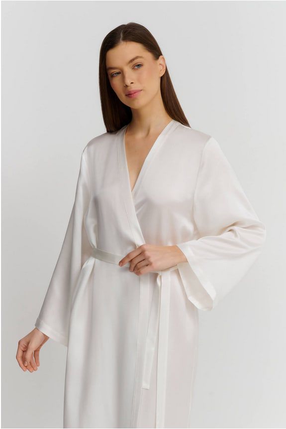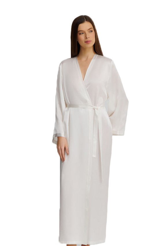 Длинный халат свободного кроя с длинными широкими рукавами, выполнен из 100% нежнейшего шелка, который мягко переливается при движении и окутывает тело роскошным комфортом. Тонкий съёмный пояс позволяет подчеркнуть талию. Практичные боковые карманы добавляют удобства, сохраняя при этом утончённую элегантность модели.