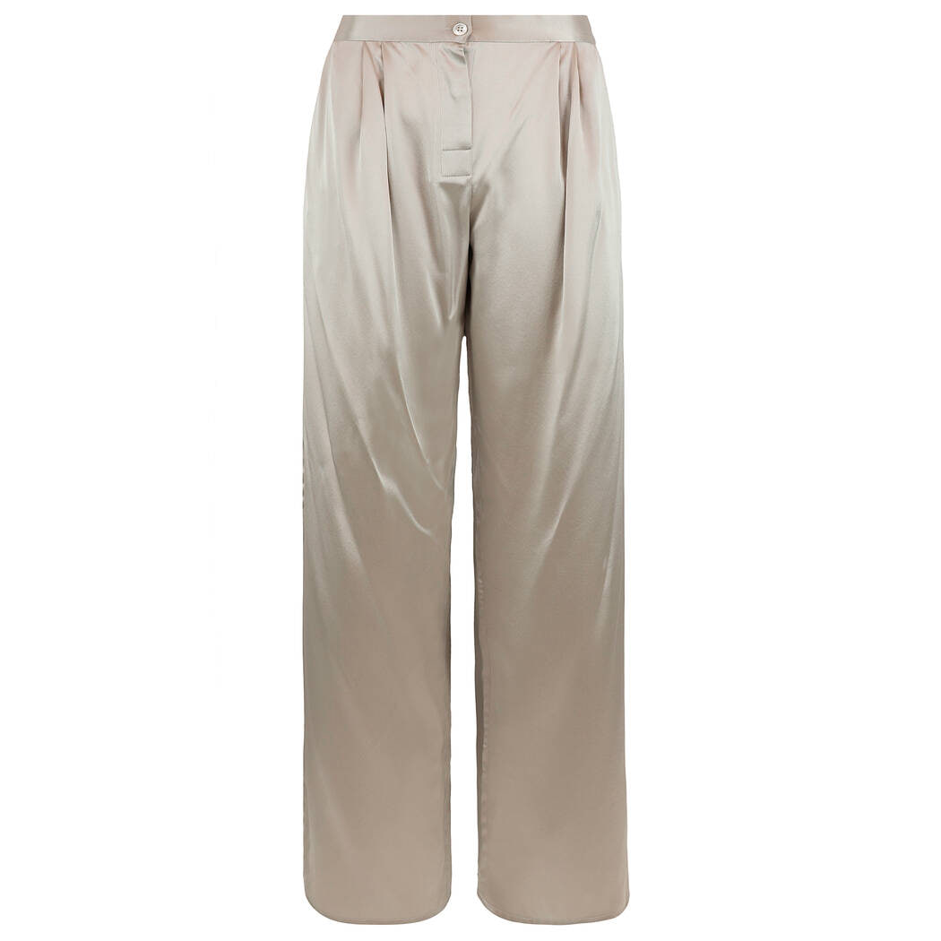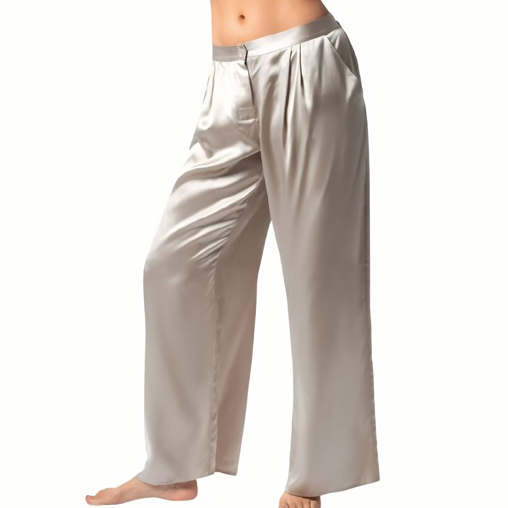 Пижамные брюки свободного кроя полностью выполнены из мягкого и роскошного шелкового атласа, который обеспечивает непревзойдённый комфорт. Модель застёгивается на пуговицу, а эластичная резинка на поясе гарантирует удобную посадку. Боковые карманы добавляют функциональности, делая образ одновременно элегантным и практичным.