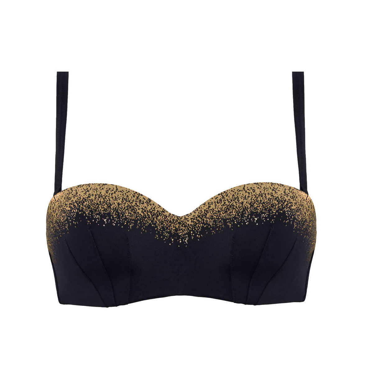 Бюстгальтер - балконет с формованными чашками, на косточках. Чашки покрыты микрофиброй, которая быстро сохнет, а золотое напыление обладает защитой от пляжного воздействия. На чашках - три шва с зубчатыми краями, которые добавляют изящества и стиля. Боковые панели дублированы и оснащены косточками. Регулирующиеся бретели отстегиваются.