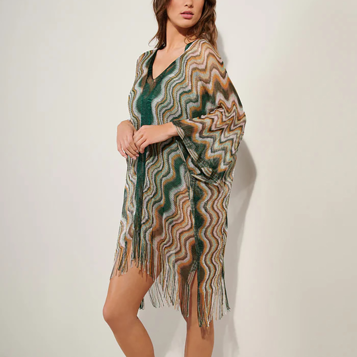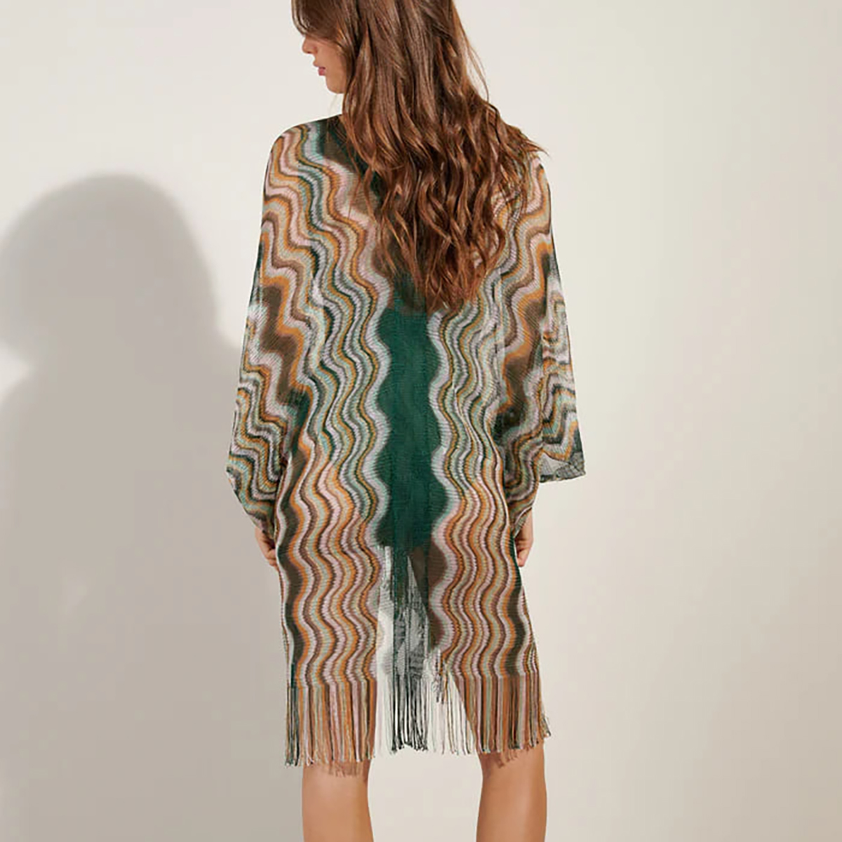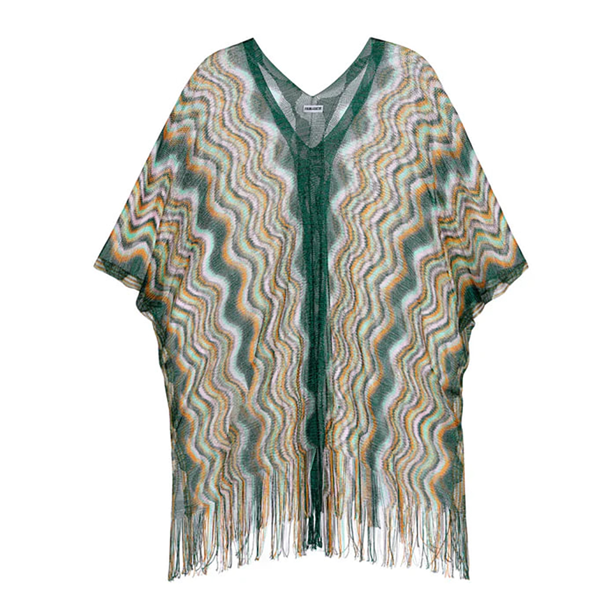 Полупрозрачная туника с V-образным вырезом на передней и задней панелях. Выполнена из мелкой сетки с разноцветным зигзагообразным принтом, что придаёт образу динамичность и живость, а бахрома по нижнему краю добавляет нотку богемного шика.