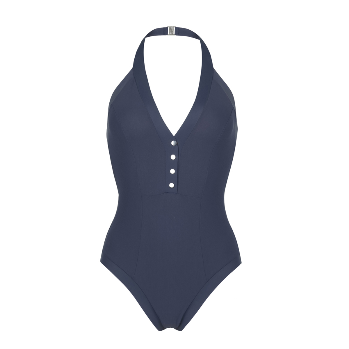 Цельный купальник без косточек с треугольной формой чашек. Пуговицы на передней панели позволяют регулировать глубину Вашего декольте. Швы на передней и задней панели структурируют силуэт, создавая еще более эффектный гламурный образ. Обнаженная спина обеспечит полную свободу движений. На шее застежка-клипса.