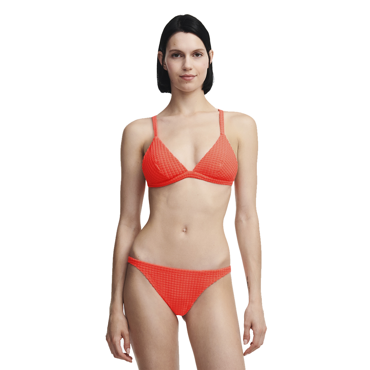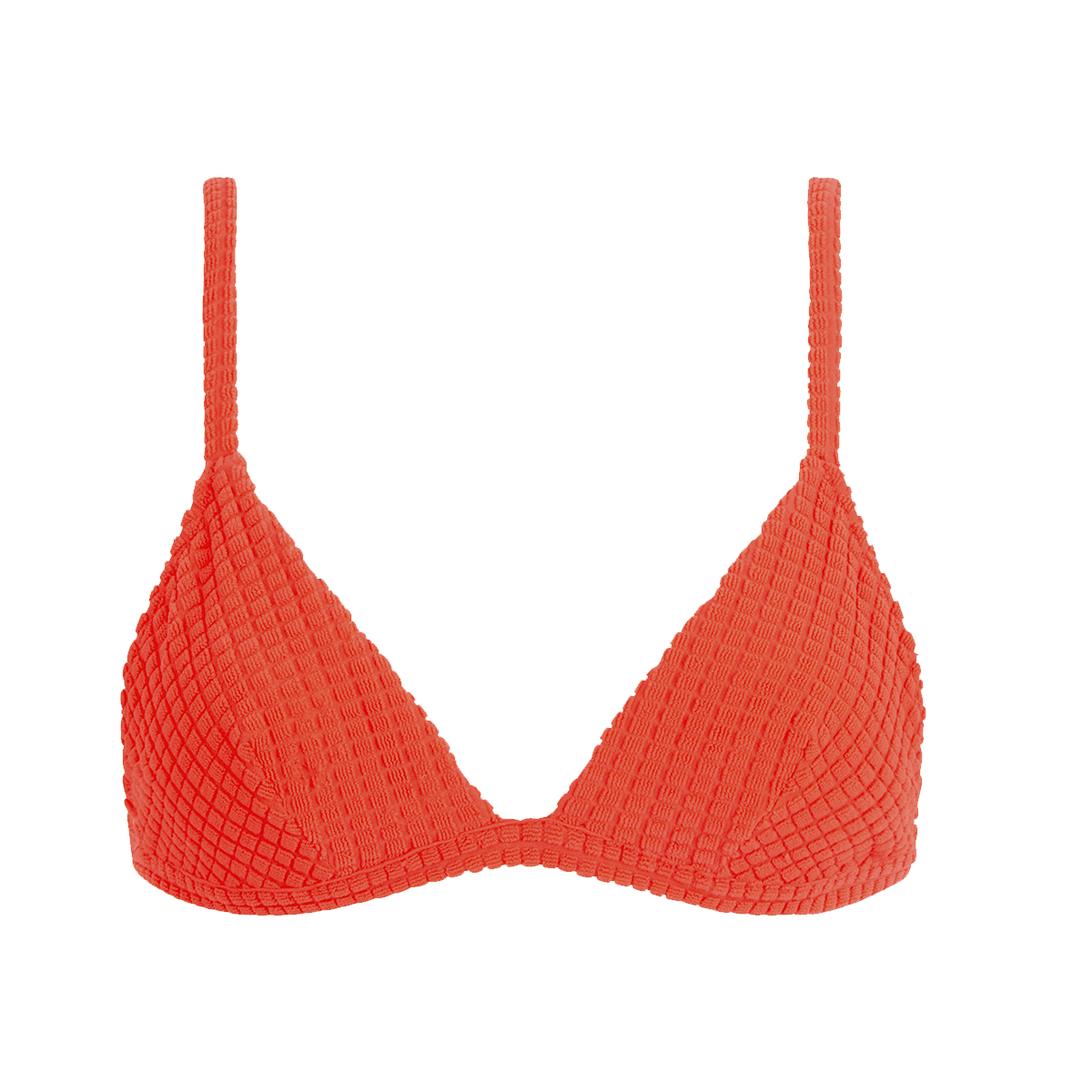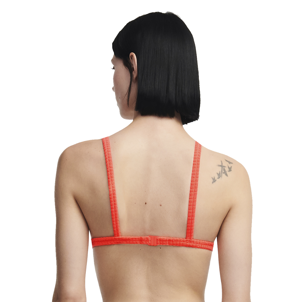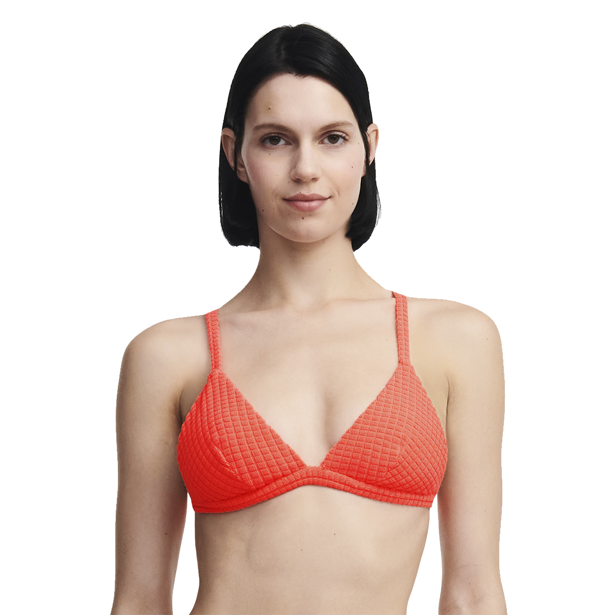 Бюстгальтер - треугольник с мягкой треугольной формой чашек без косточек. Застежка на спине на клипсе. Бретели не регулируются. Выполнен из материала с "махровым" эффектом.