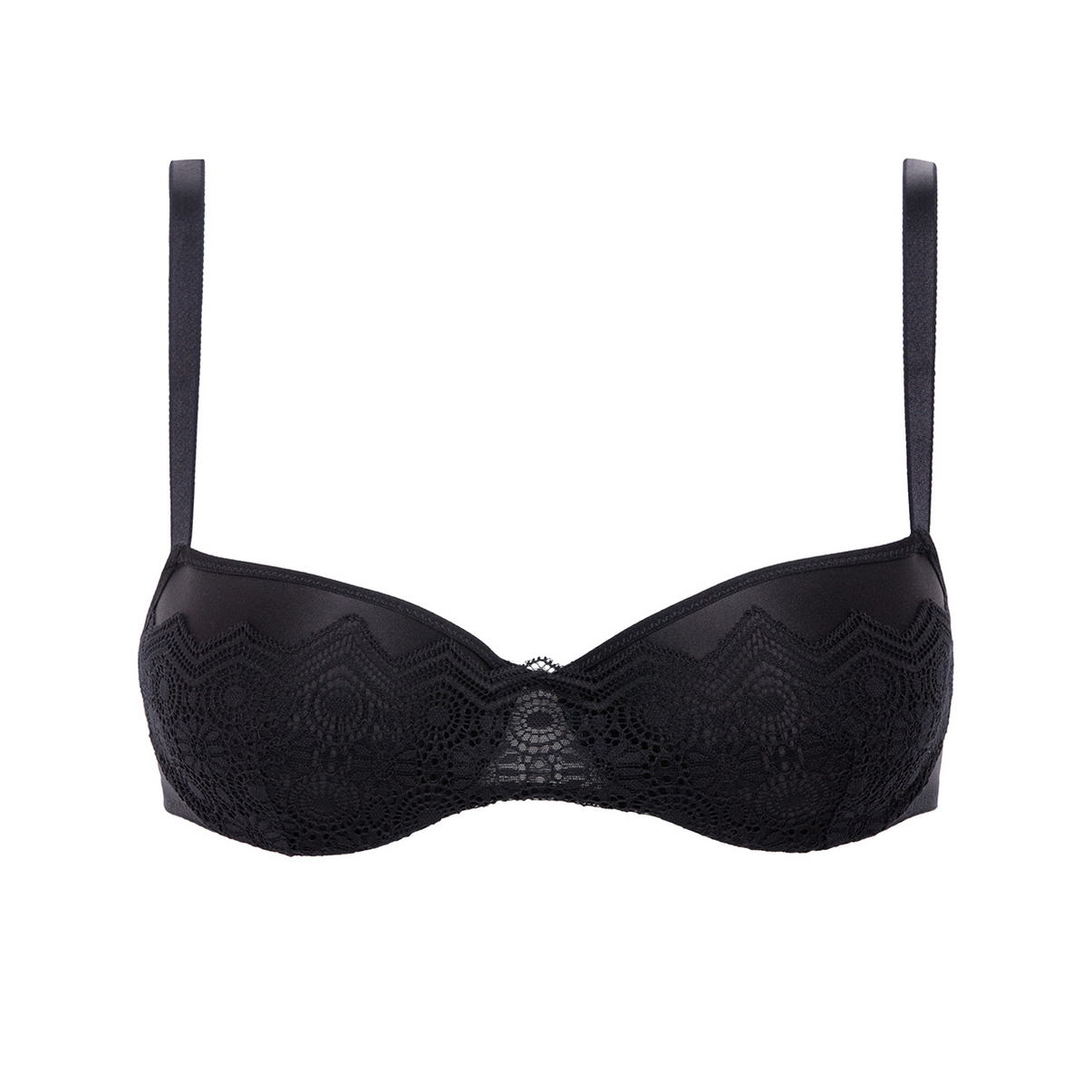 Бюстгальтер - пуш ап с уплотненной формой чашек с интегрированными подушками. Чашки покрыты графичным кружевом с контрастной отделкой. Регулирующиеся бретели.