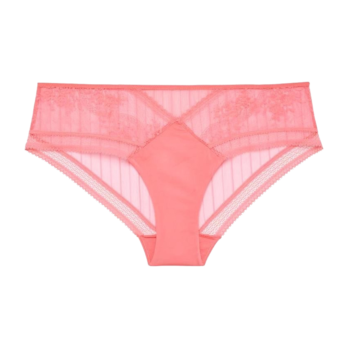Трусы - боксеры со средне-заниженной посадкой. Передняя панель выполнена из кружева с цветочным орнаментом, дополнена вставкой из тюля и декоративной тесьмой; задняя панель - из тюля в полоску.