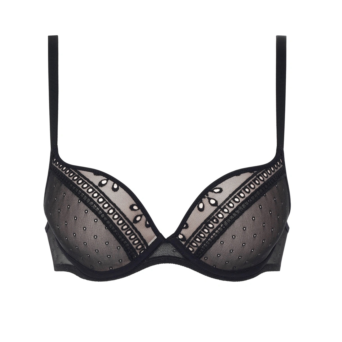 Бюстгальтер - пуш ап на косточках, с интегрированными подушками. Чашки покрыты ажурным тюлем и декорированы роскошной и романтичной, неподвластной времени вышивкой в стиле Ришелье. Центральная и задние панели выполнены из ажурногот тюля. Регулирующиеся бретели.