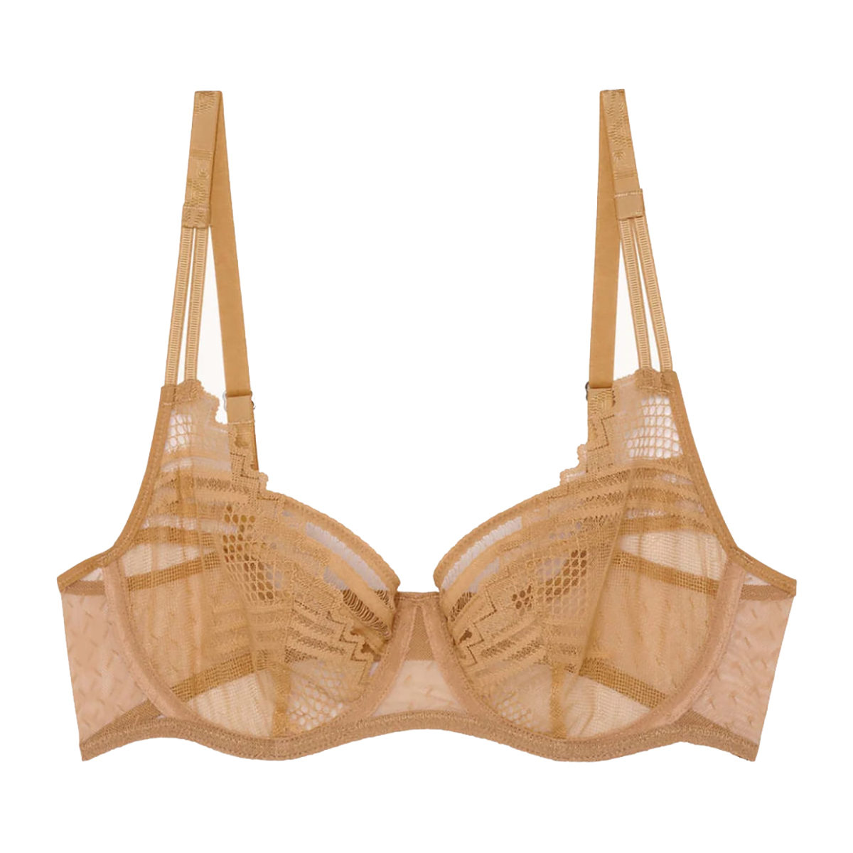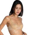 Бюстгальтер-балконет с мягкой формой чашек на косточках. Чашки выполнены из прозрачного тюля и покрыты кружевом с графичным орнаментом. Верхняя часть чашек дополнена кружевом. Широкая основа бюстгальтера выполнена из тюля. Боковые панели также – из тюля. Регулирующиеся бретели. Дублированные чашки для придания необходимой поддержки, начиная с размера С70.