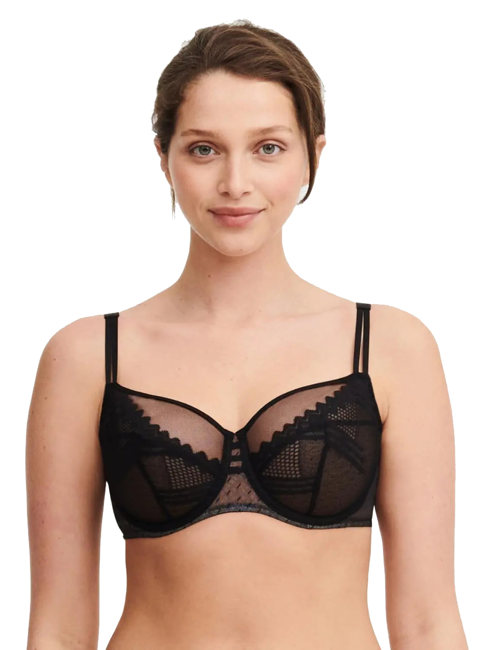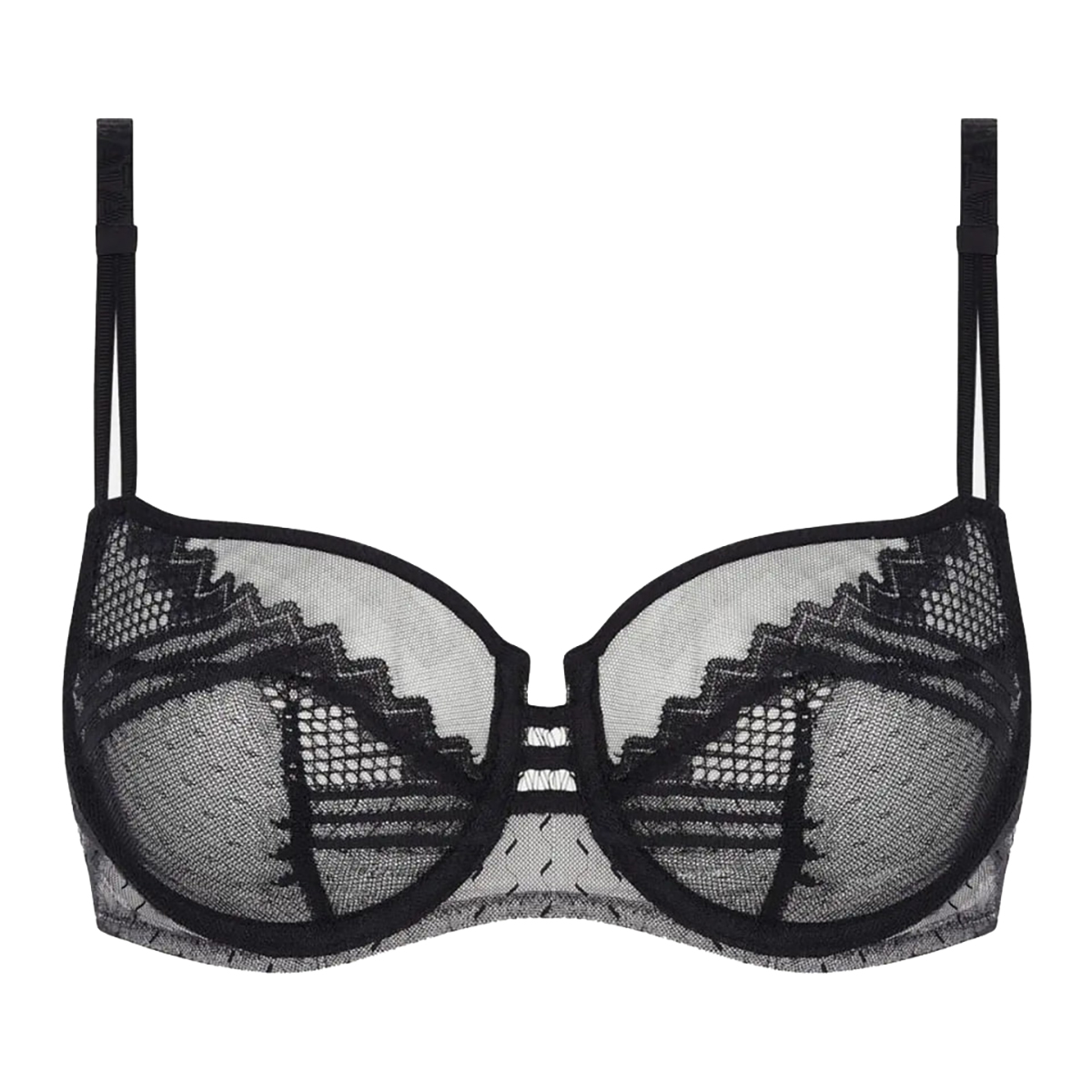 Бюстгальтер-формованный на косточках с полной чашкой обеспечивает оптимальную поддержку и естественно округлую форму груди. Выполнен из прозрачного тюля, украшенного нежным кружевом с геометрическим орнаментом. Фиксированные регулируемые бретели у основания двойные. На задней панели — застёжка, обеспечивающая надёжную посадку.