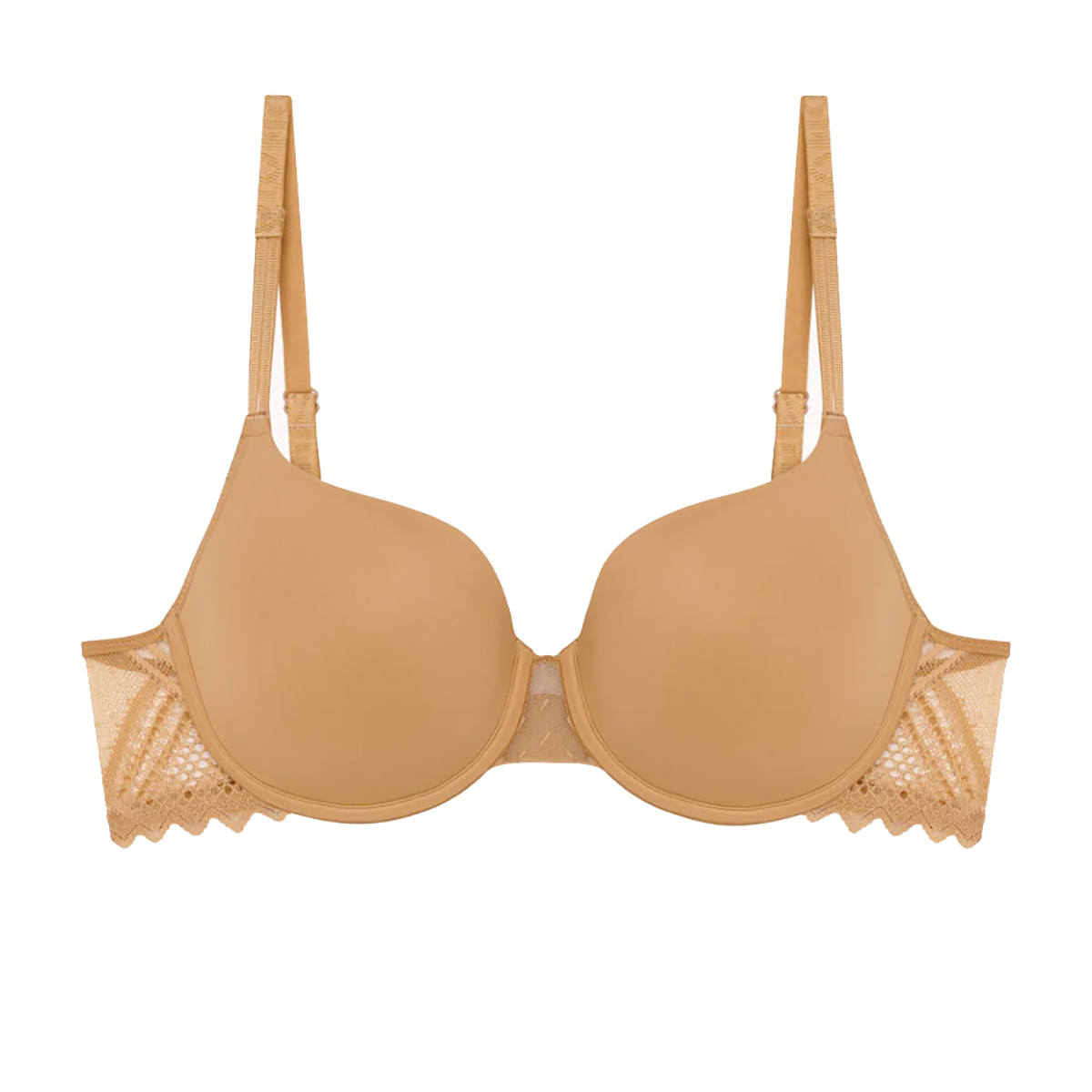 Бюстгальтер - формованный со слегка уплотненной гладкой формой чашек на косточках. Чашки покрыты гладкой бесшовной микрофиброй для максимальной невидимости под одеждой. Боковые панели - из кружева с графичным орнаментом. Регулирующиеся бретели.