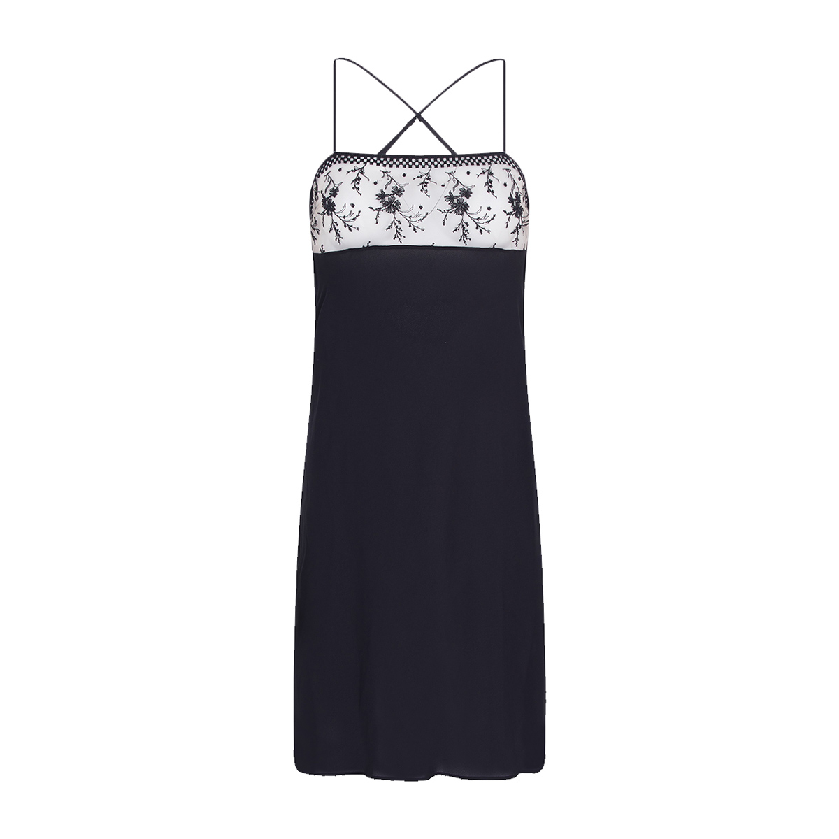 Короткая комбинация свободного кроя на тонких бретелях. Полностью выполнена из полиэстера. Передняя панель в верхней части (в области груди) выполнена из бежевого тюля расшитого контрастной цветочной вышивкой, которая создает эффект тату на теле. Регулирующиеся бретели перекрещиваются на спине.