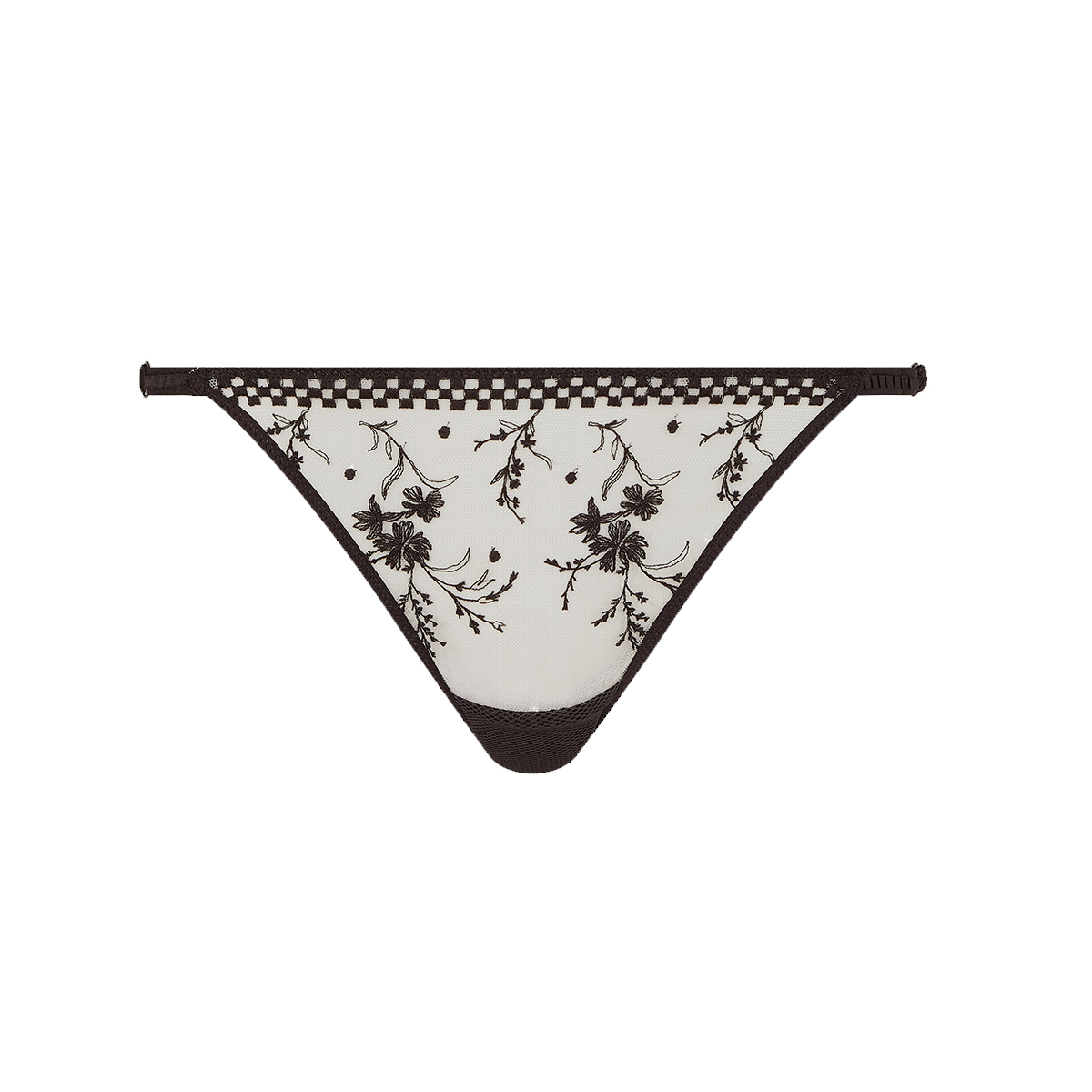 Трусы - стринги со средне - заниженной посадкой. Передняя и задняя панели выполнены из расшитого цветочной вышивкой тюля, боковые - эластичные резинки.