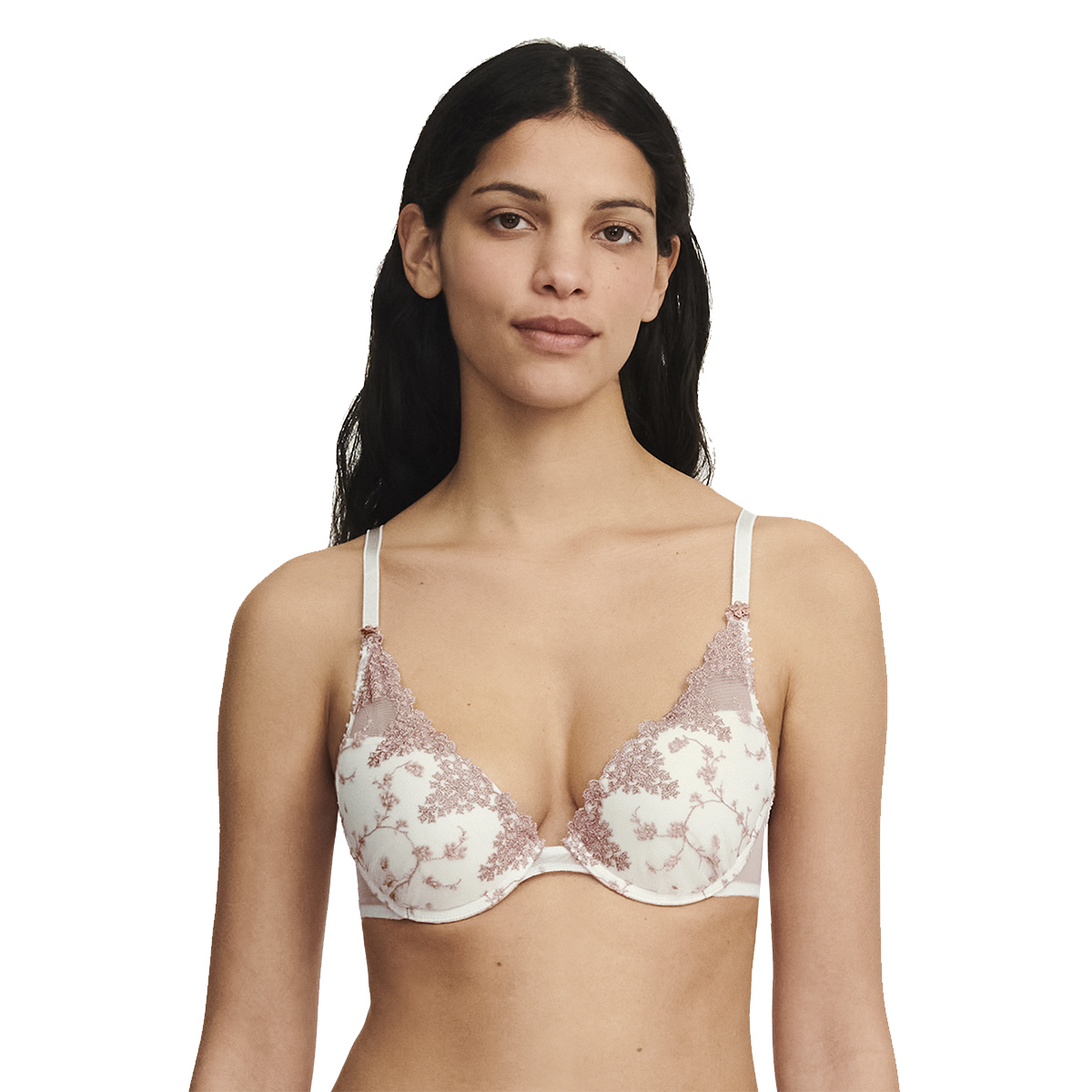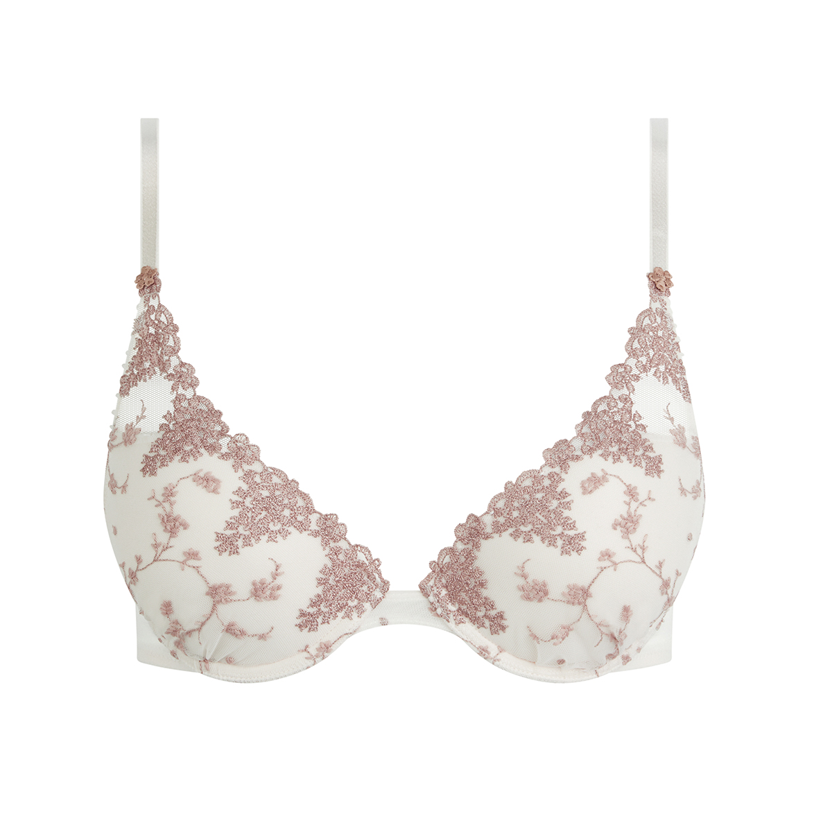 Уплотненный бюстгальтер пуш ап с интегрированными подушками и красивым глубоким декольте; чашки задрапированы тонким тюлем с нежной цветочной вышивкой по фону и контрастной вышивкой по краю декольте; между чашками и у основания бретелек - крошечные цветочки.