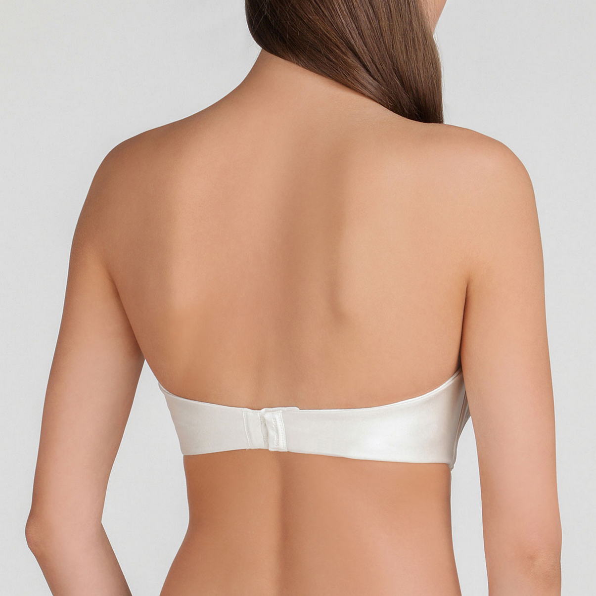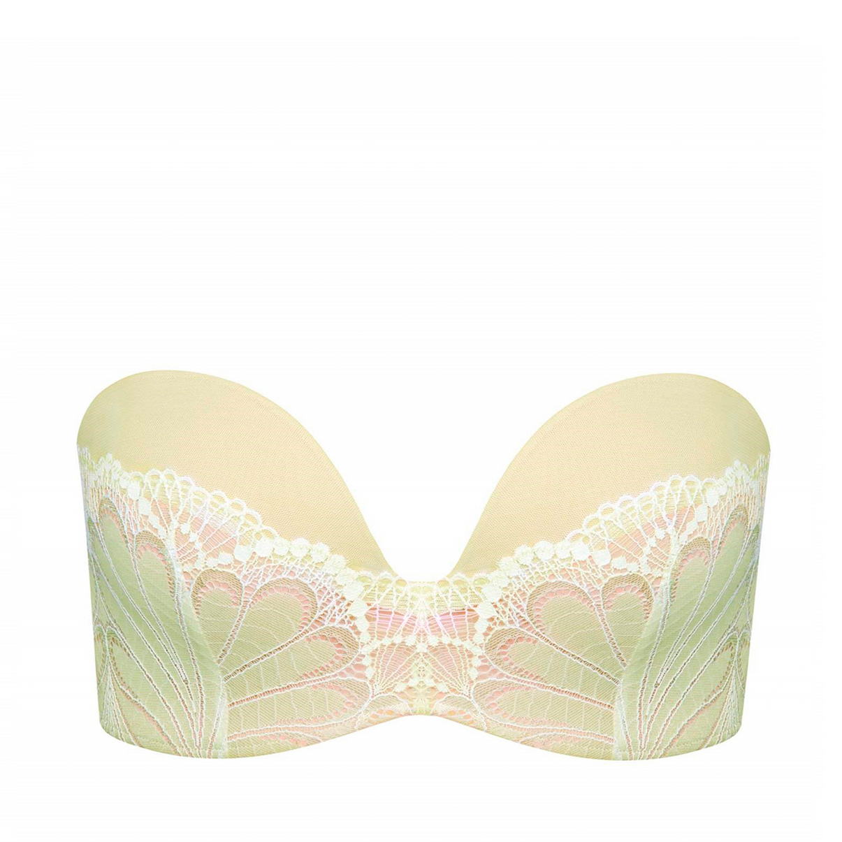 Бюстгальтер без бретелей с формованными чашками, покрытыми кружевом с мотивом павлиньих перьев, обеспечит Вам непревзойденное декольте и комфорт. Поддержку гарантирует особая "четырехпальцевая " конструкция в форме ладоней, которые расположены по бокам чашек бюстгальтера. "Ручки" из поликарбоната, встроенные в чашки, поддерживают Вашу грудь простым и эффективным способом: они действуют как Ваши собственные руки. Глубокий вырез; боковинки бюстгальтера полностью покрыты силиконовыми вкраплениями, обеспечивающими ношение бюста без бретелей.